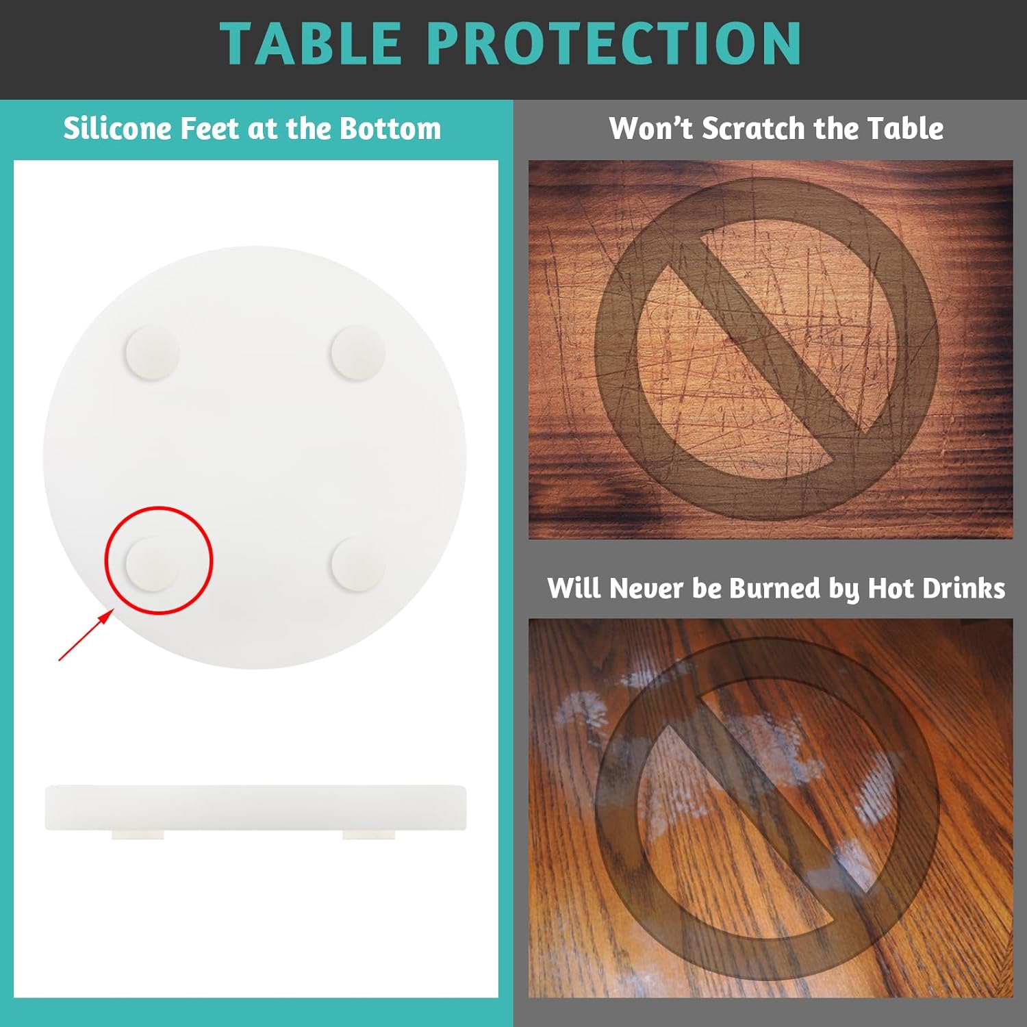 - [ Ultimate Table Protection ] : Each coaster is equipped with 4 silicone feet on the underside, protecting your surfaces from scratches. The coastersโ thickness and heat-resistant properties, combined with the silicone feet, prevent heat damage and unsightly marks from hot beverages.