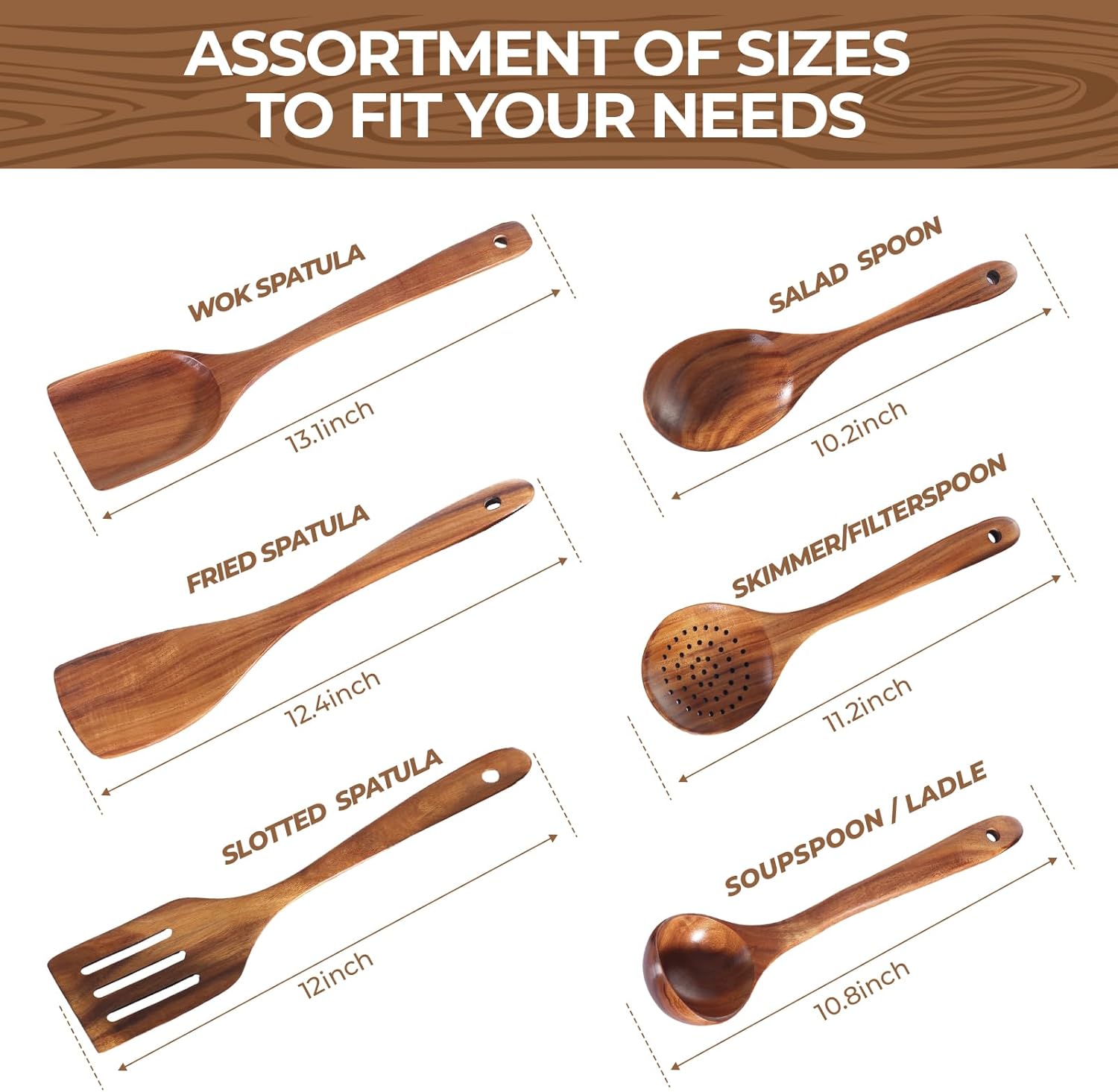 - 100% Natural Teak Wood--Crafted from 100% teak, meticulously cut and polished from a single piece of teak, this wooden kitchen utensils are both Durable and Lustrous. This Non-toxic wooden utensil set are suitable for everyday use without the concern of easily being damaged