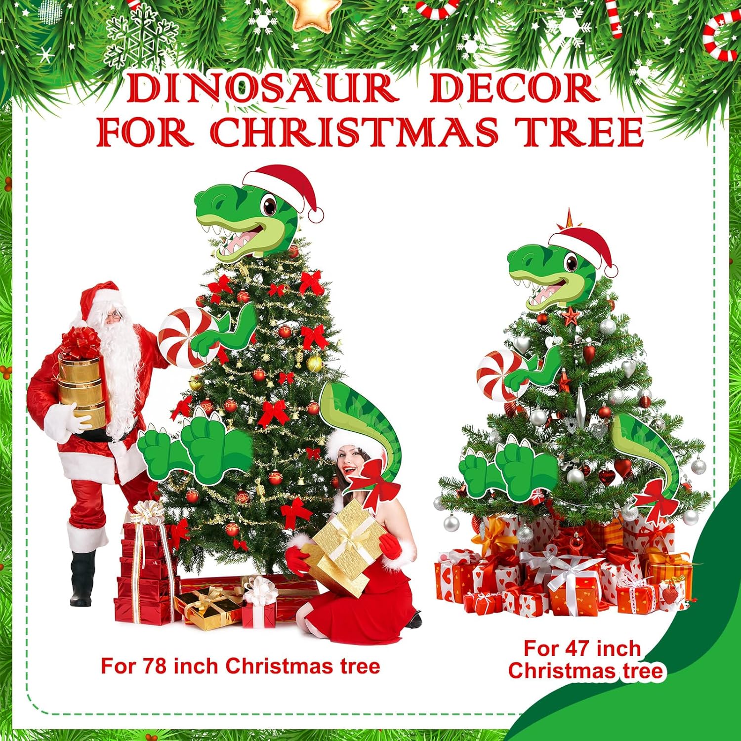 - Ideal Size: the dinosaur decoration features a head measuring around 13.74 x 10.47 inches, a tail measuring about 8.74 x 14.33 inches, hands sized about 10.83 x 7.09 inches and the left leg is about 6.3 x 6.26 inches, and the right leg is about 7.95 x 8.35 inches; This dinosaur tree topper set is suitable for a wide range of Christmas tree sizes, ensuring a delightful touch for your holiday decorations