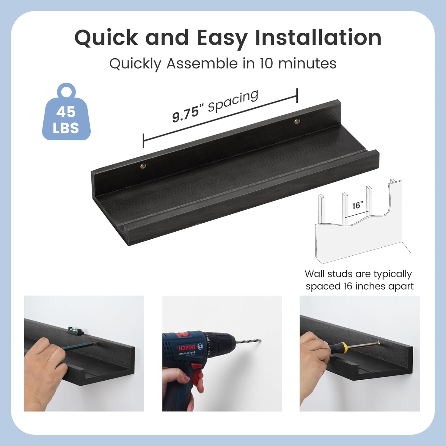 Picture Ledge Wall Shelves - 16 Inch Width Set of 3, Solid Pine Wood Rustic Floating Ledge Shelves for Kids' Room, Bedroom, Kitchen, Bathroom, Living Room, Nursery Display Decor, Black