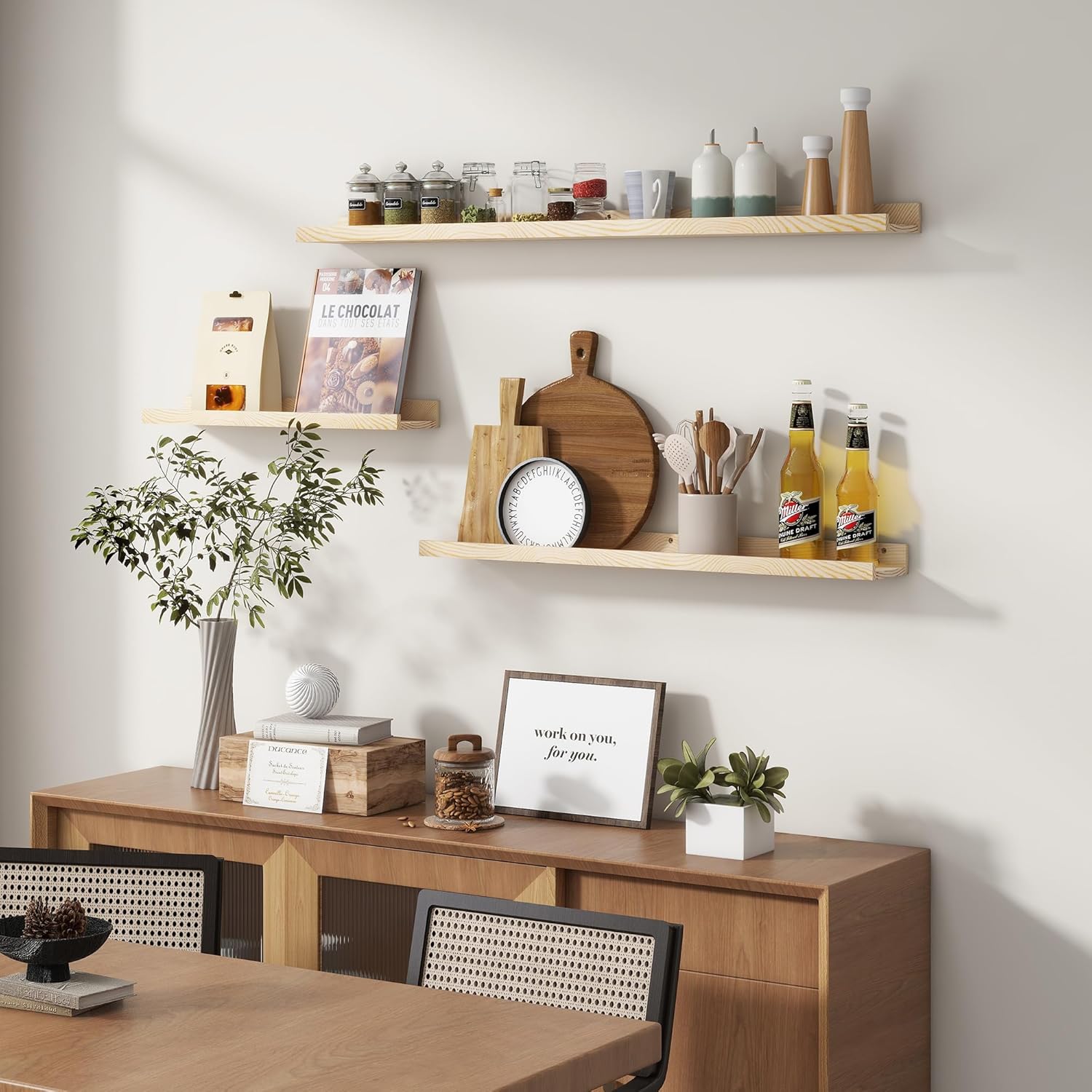 Picture Ledge Shelf for Wall, 16 inches Solid Pine Wood Nursery Book Shelves 3 Packs, Floating Ledge Shelves for Kids' Room Bedroom Bathroom Living Room Photo Frames Office Nursey Wall Decor, Natural