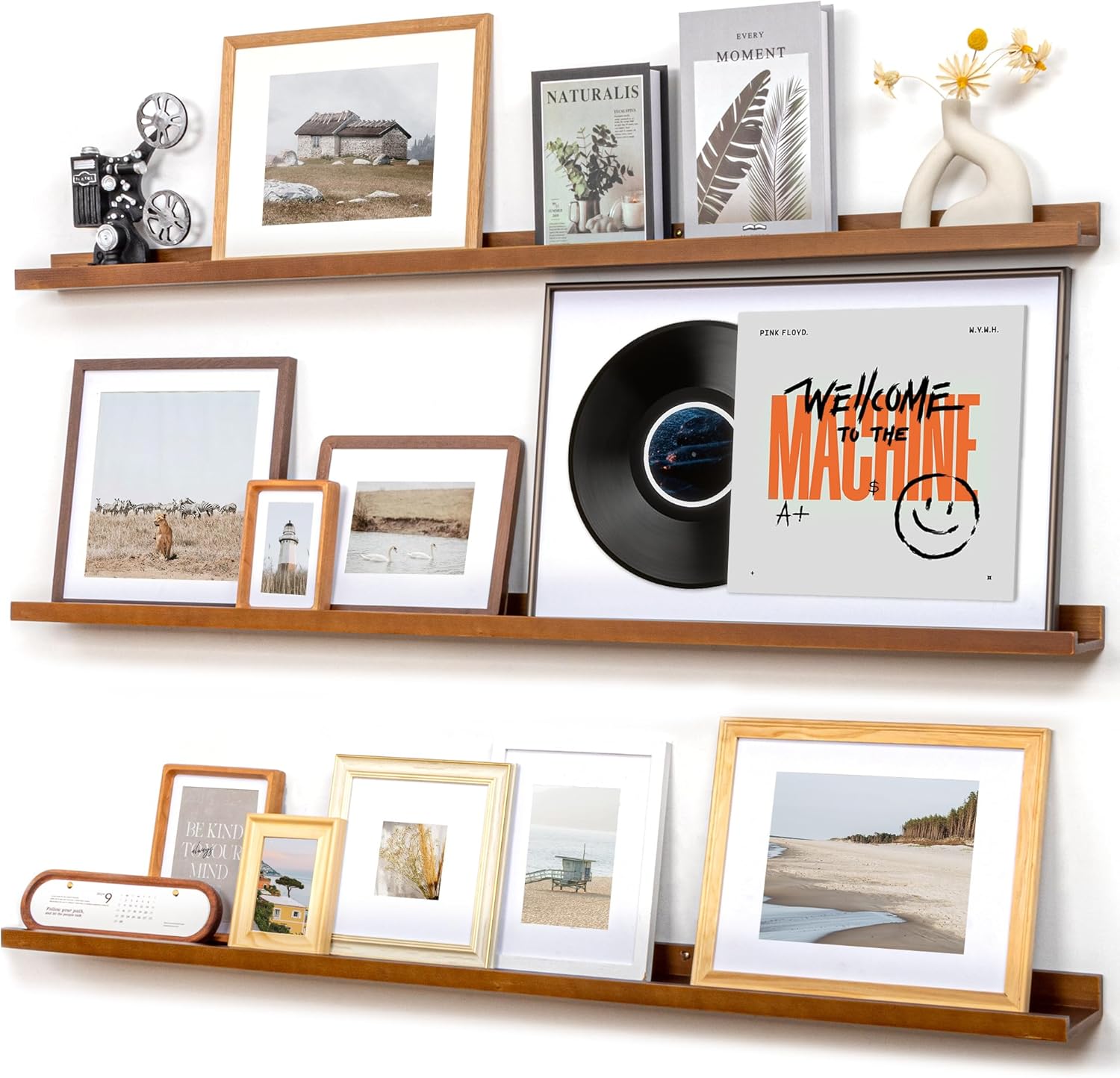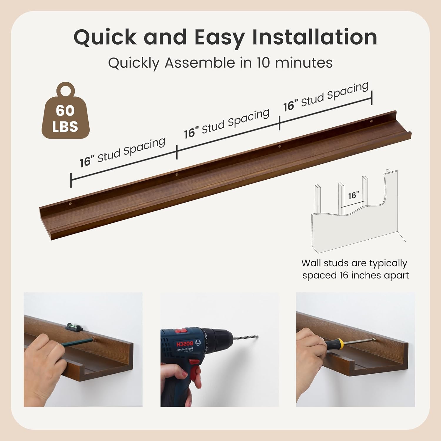 - Easy to Install: You will get a level, screws for the wall, drywall anchors, a detailed installation guide, and two beautiful hand-crafted solid pine wood shelves. With the level, you can make sure your picture ledge shelves are well aligned. Just follow the simple instruction to install the hanging shelves for wall decor within 10 minutes. We add additional screw and anchor to the hardware bag just in case. If you have any questions about our products, please feel free to contact us
