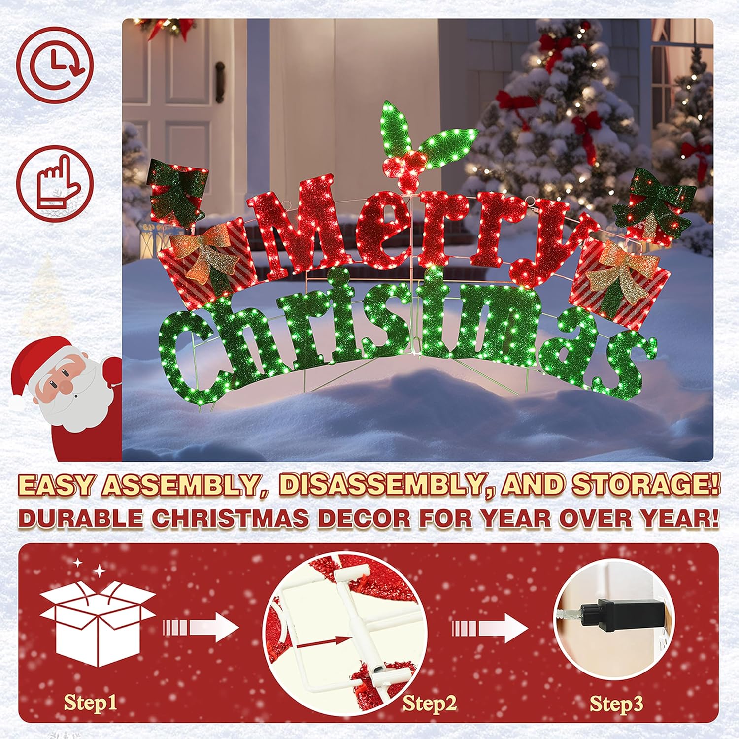 - Easy to Assembly: It only takes 3 steps to assembly. Step 1: Take out all the items from the package. Step 2: Assemble it according to the instructions. Step 3: Plug in the socket to light it up. If you are going to use this Merry Christmas sign on the ground, donβ t forget the ground stakes included that will make it well fixed