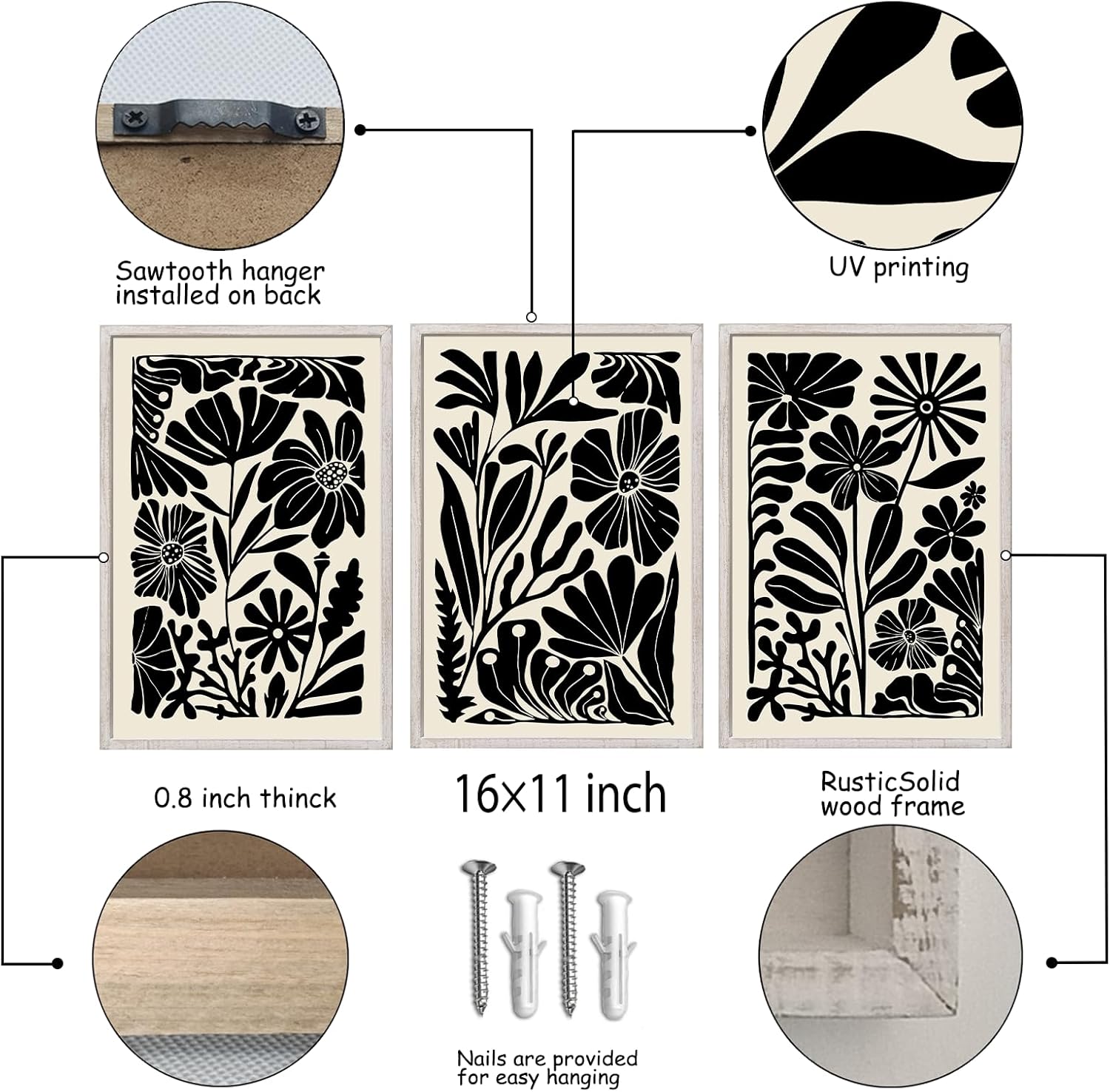 Abstract Floral Botanical Wall Art 16x11 Inch 3 Piece Black Vintage Boho Plant Flower Minimalist Wood Frame Sign Home Living Room Family Office Mid Century Print Wall Hanging Decor (White)
