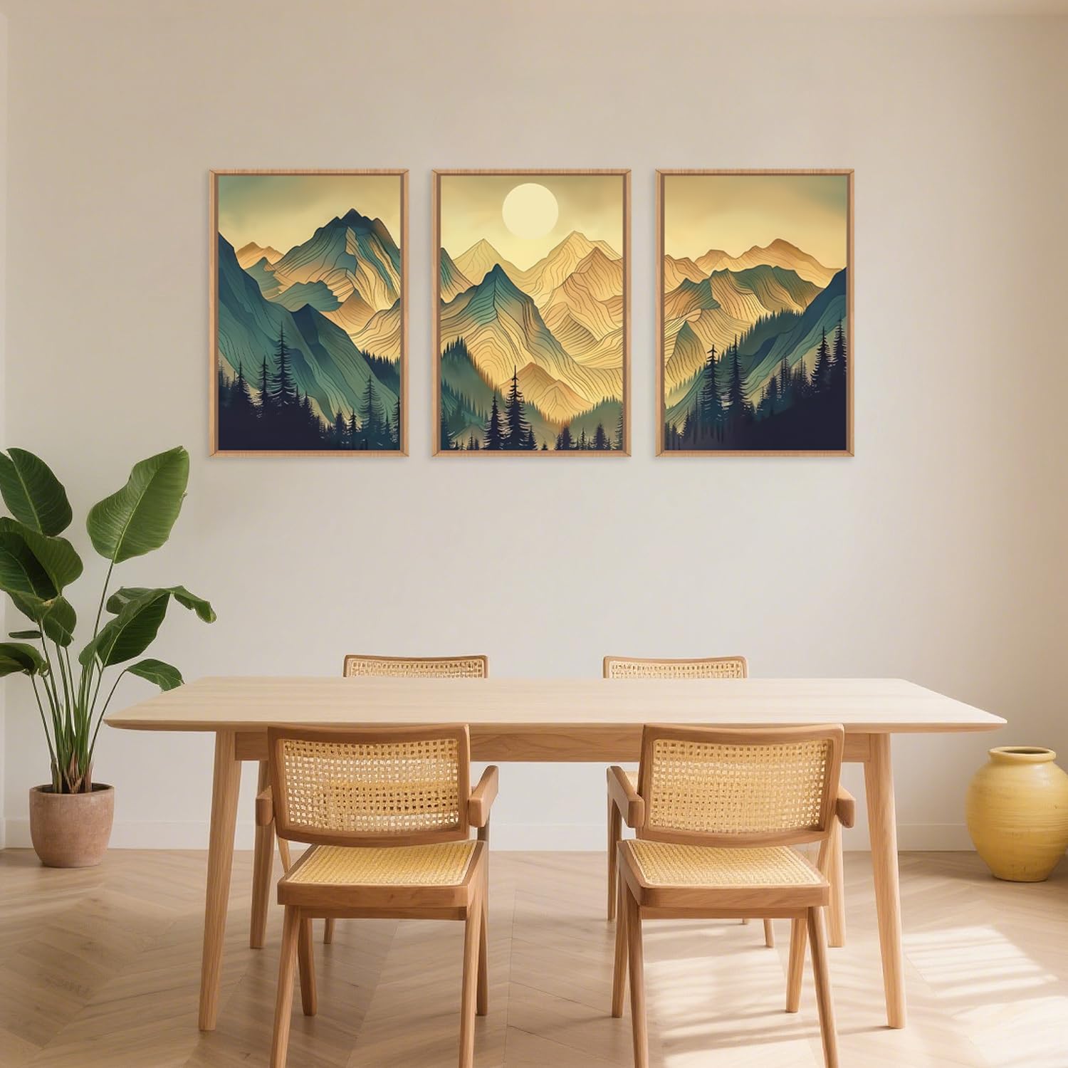 Celestdeco Mountains Forests Framed Canvas Wall Art Set, Abstract Sun Woodland Painting, Boho Scenery Sun Wall Decor, Natural Woodgrain Art Print for Living Room, Bedroom, Dining Room, Office - 16"x24"x3