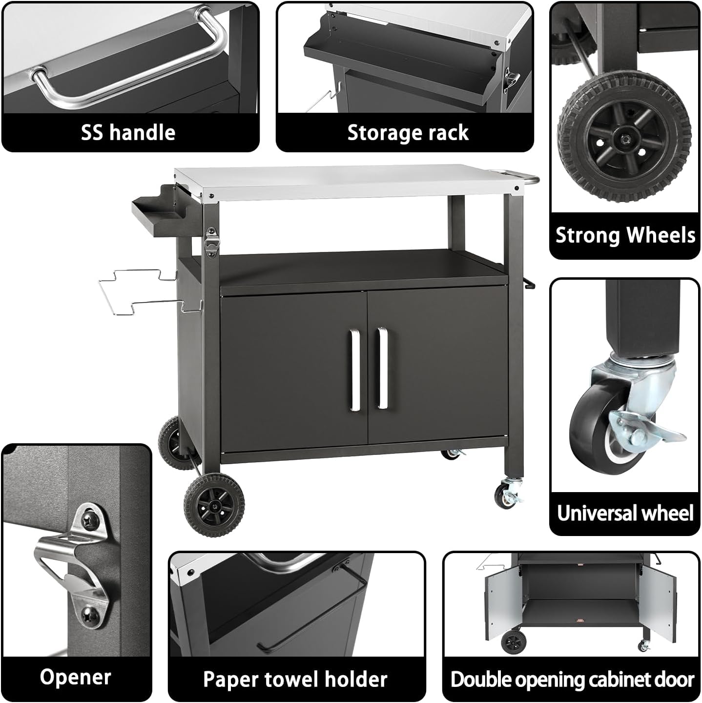 Grill Cart Table with Big Storage Cabinet, Movable Outdoor Dining Cart Pizza Oven Stand, Kitchen Cart Island Multifunction Food Prep Table Stainless Steel Surface