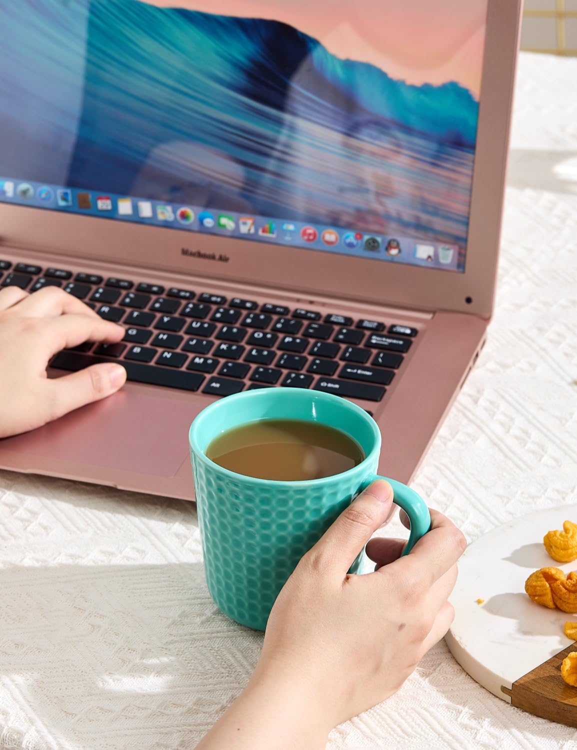 Ceramic Coffee Mugs 15 oz, Large Waffle Embossed Mug Set with Handle, Unique Coffee Cups for Latte, Cappuccino, Cocoa, Hot Tea, Mocha, Milk, Housewarming Wedding Present - Set of 6 (Turquoise)