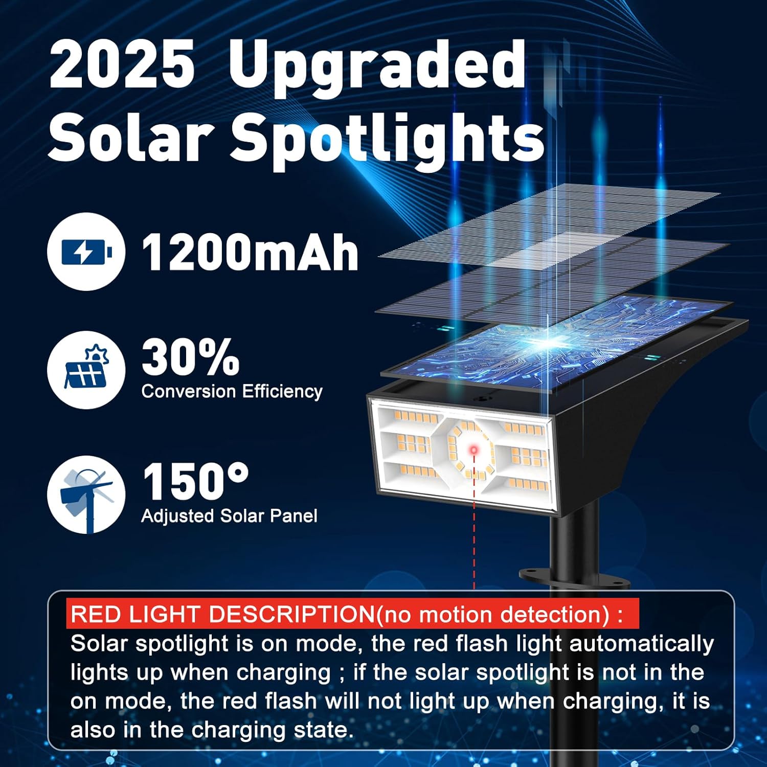 - 【𝐋𝐨𝐧𝐠-𝐋𝐚𝐬𝐭𝐢𝐧𝐠 𝐈𝐥𝐥𝐮𝐦𝐢𝐧𝐚𝐭𝐢𝐨𝐧】 Equipped with 56 LEDs, our solar spotlights create the perfect lighting effect wherever they are placed. The 150° adjustable head allows you to direct light exactly where you need it. Harness the power of the sun to brighten your garden without high electricity costs. With a maximum brightness of 1000 lumens, these solar landscape spotlights provide 8-18 hours of illumination depending on charge time—longer, brighter, and more durable than other solar spotlights on the market.