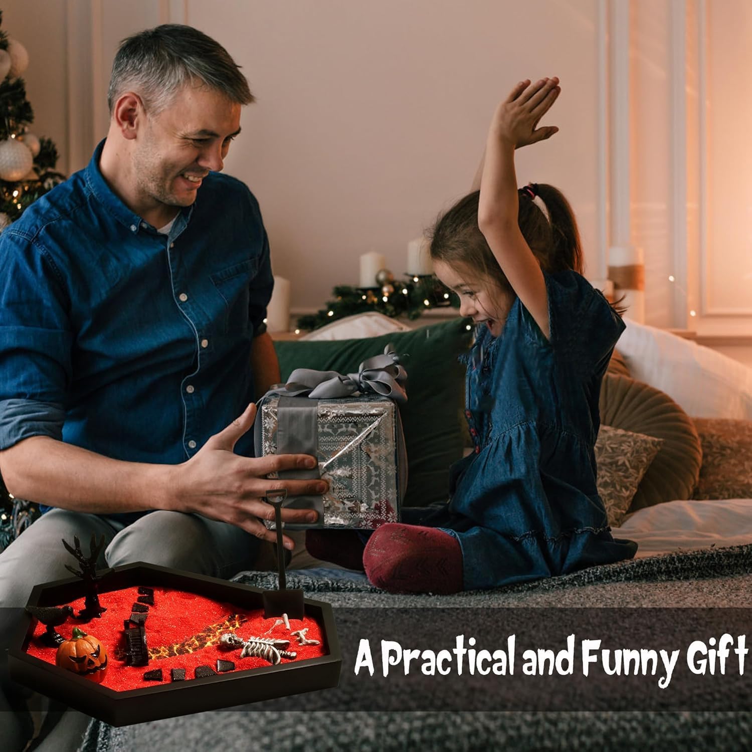 - π DIY: Our Halloween Coffin Zen Garden is designed to resemble a traditional coffin.This product has 9 accessories including 1 Gothic coffin tray, 1 bridge, 1 bag of red sand, several pieces of molten rock, crows, a shovel, a dead tree, a half skeleton, and a base image of molten rock. On the special holiday of Halloween, you can place your imagined hell world, the intersection of life and death, and so on in any corner of your home to present the atmosphere of Halloween you want. Any artistic conception you want to express can be created by yourself.