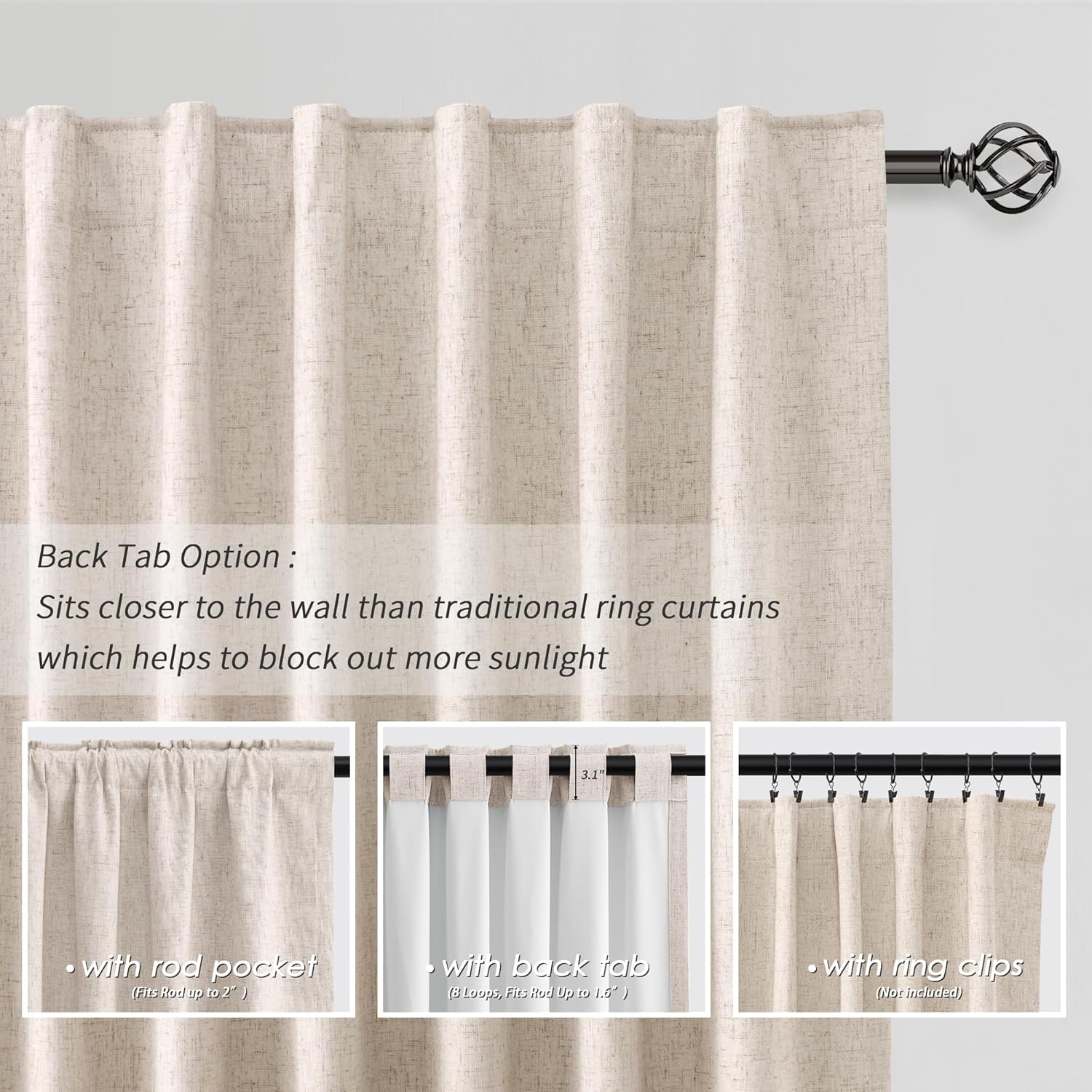 - 3 Hanging Options: Differ from the traditional curtains with grommet, BOODII linen curtains with back tab and rod pocket can full block sunlight fully. (1) Using the back tabs design to create an elegant pleated look and sit closer to the wall than traditional ring curtains, which helps to block out more sunlight; (2) Using rod pocket for a classic effect; (3) Using clip rings on track system or curtain rod, slide open/closed easily (clip rings are not included).