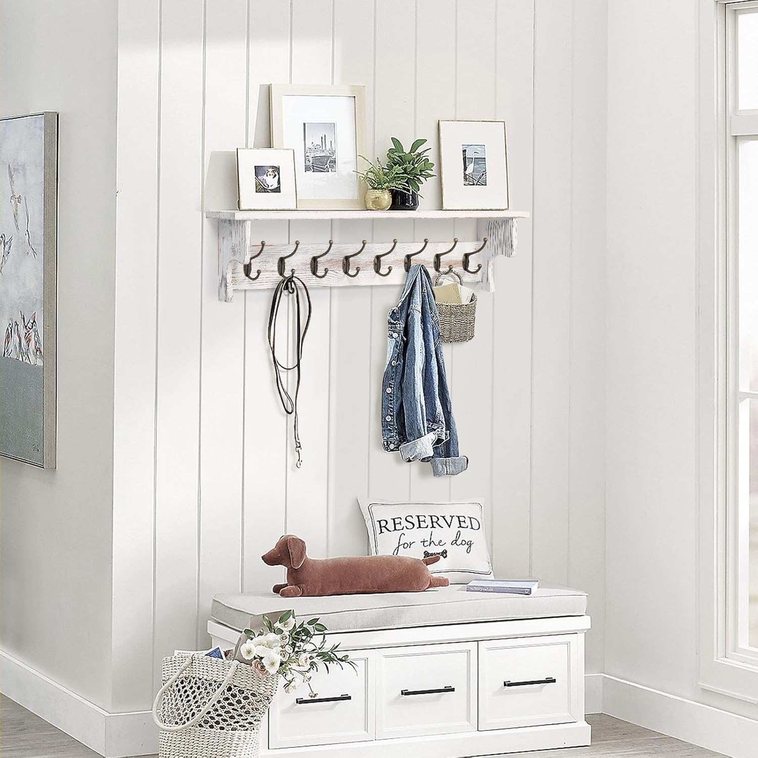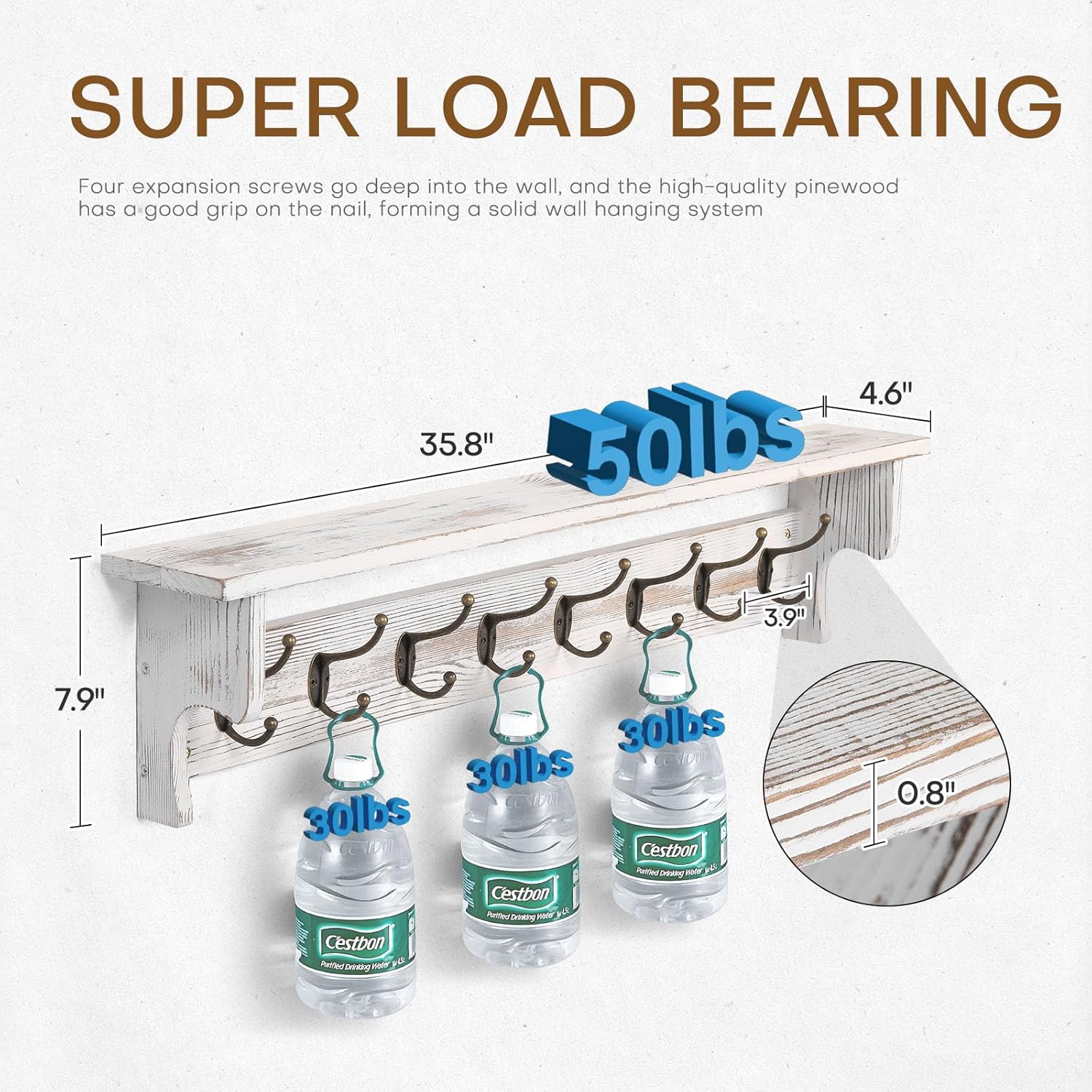 BECHAEO 35.8'' Wood Coat Rack Wall Mount with Shelf, White Wall Coat Rack with Hooks, Farmhouse Rustic Coat Hooks for Entryway Bathroom Hallway Kitchen Bedroom