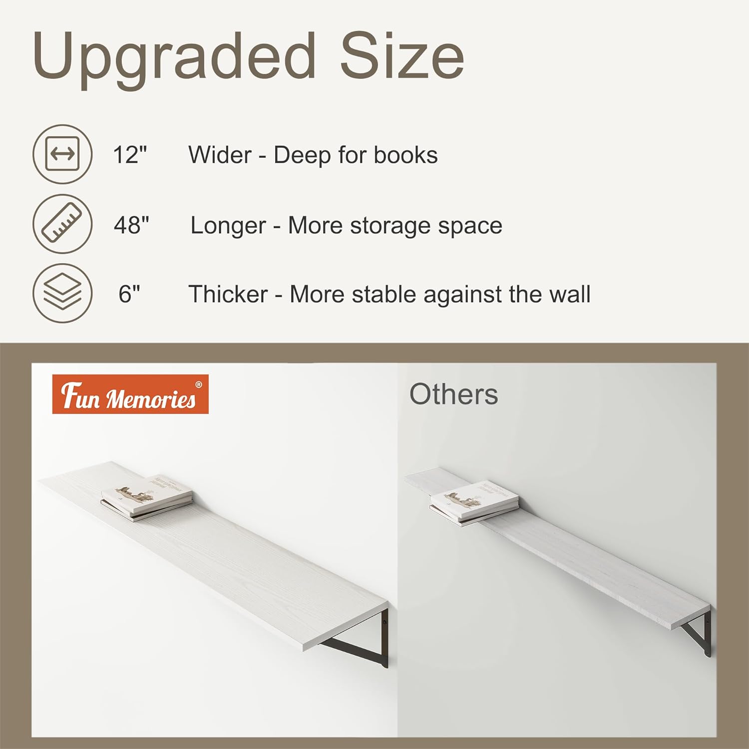 12 Inch Deep Floating Shelves, White Floating Shelves 48W x 12D, Deep Wall Shelves Bracket Set of 2, Large Display Hanging Floating Shelf for Bathroom, Living Room, Wide Storage Wooden Wall Shelf