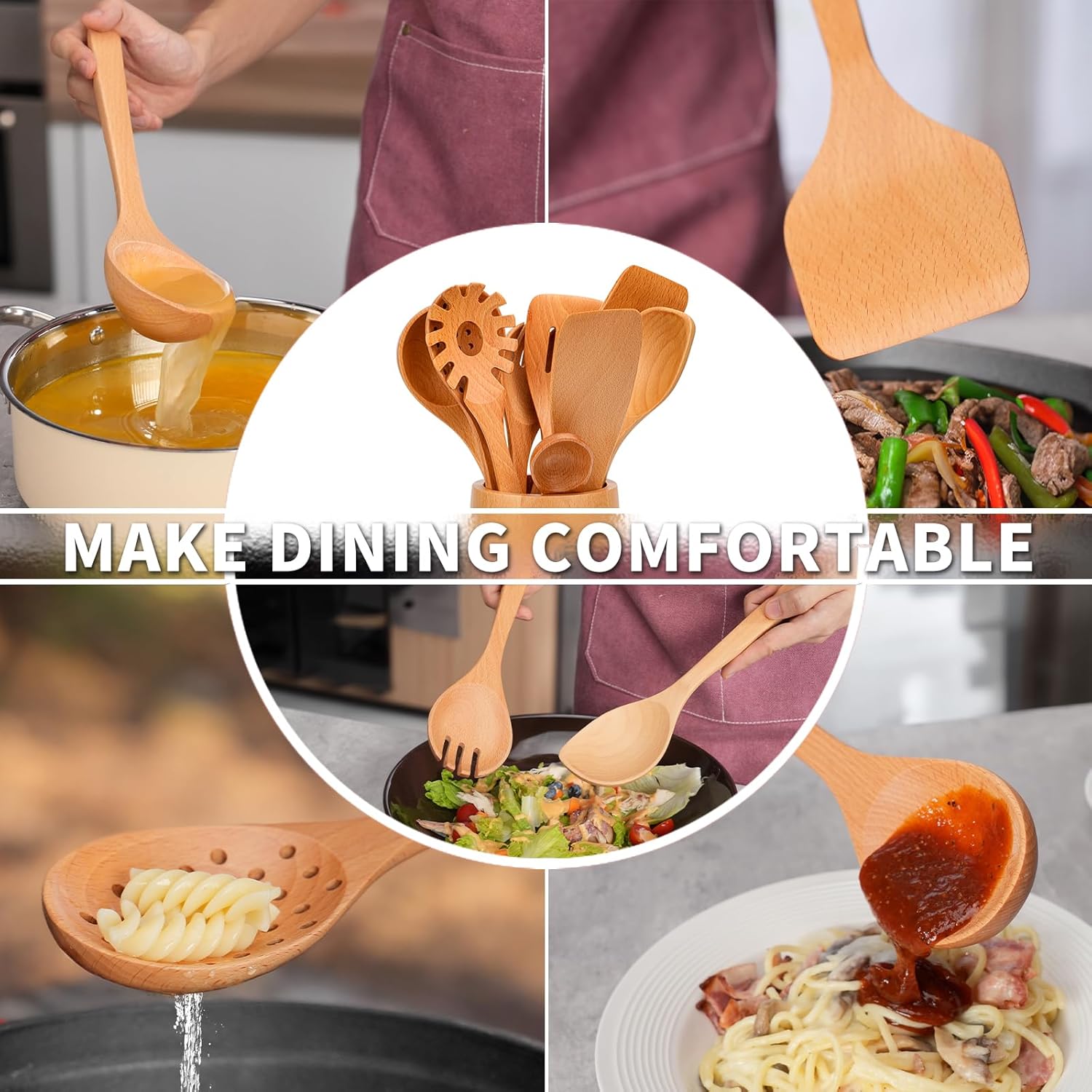 - NATURAL Beech WOOD: Crafted from solid teak wood, our utensil set is 100% handmade and eco-friendly. It's durable and crack-free, unlike silicone or bamboo alternatives. Note: Natural wood utensils may have slight color variations.