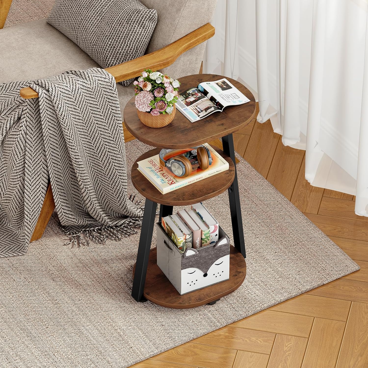 Side Table, Small End Table with Metal Frame, 3-Tier Bedside Tables, Round Side Tables for Living Room Bedroom Couch Bathroom, Oval, Vintage Brown