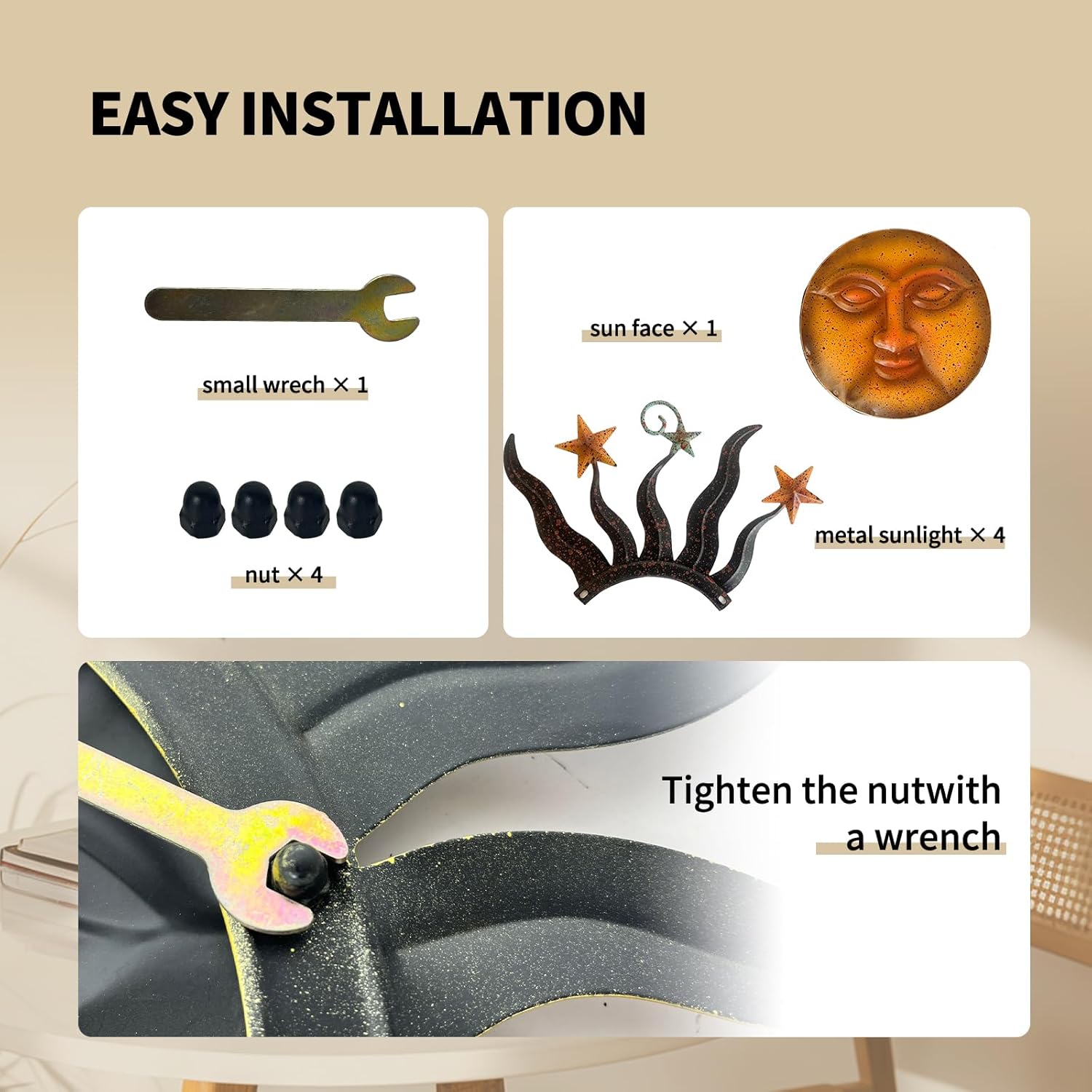 - Easy To Hang - This sun wall decor is designed with a hook on the back, which can be hung together or separately. Sun measures 24" x 24"