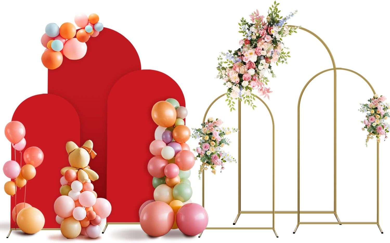 Arch Backdrop Stand and Cover Set, 3 Metal Balloon Arch Backdrop 4ft 5ft 6ft, Gold Arched Stand Frame for Wedding, Parties,Birthday, Backdrop Decorations (Red,4ft+5ft+6ft)