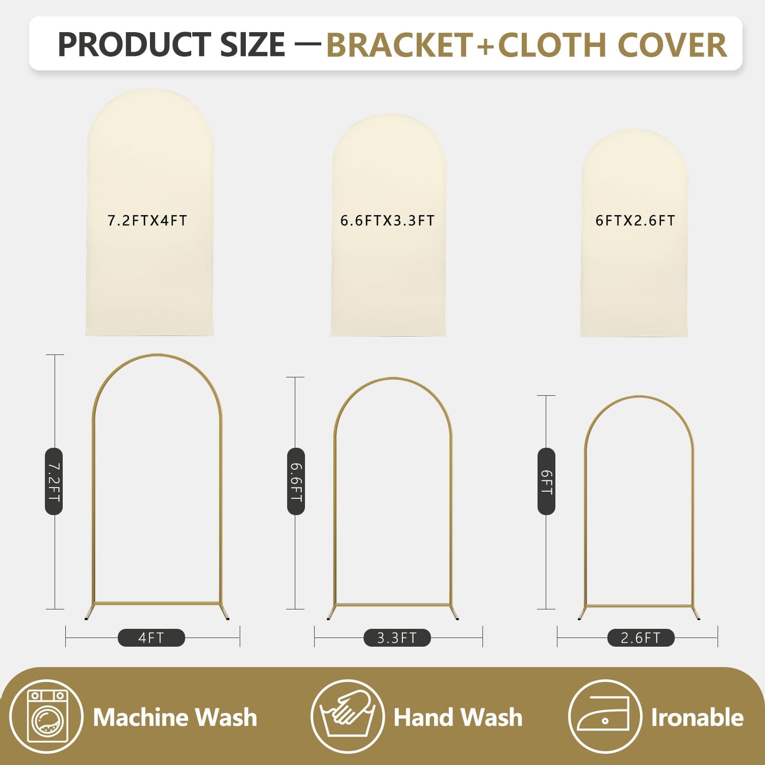 Arch Backdrop Stand and Cover Set, 3 Metal Balloon Arch Backdrop 7.2ft 6.6ft 6ft, Gold Arched Stand Frame for Wedding, Parties,Birthday, Backdrop Decorations (Beige,7.2ft+6.6ft+6ft)