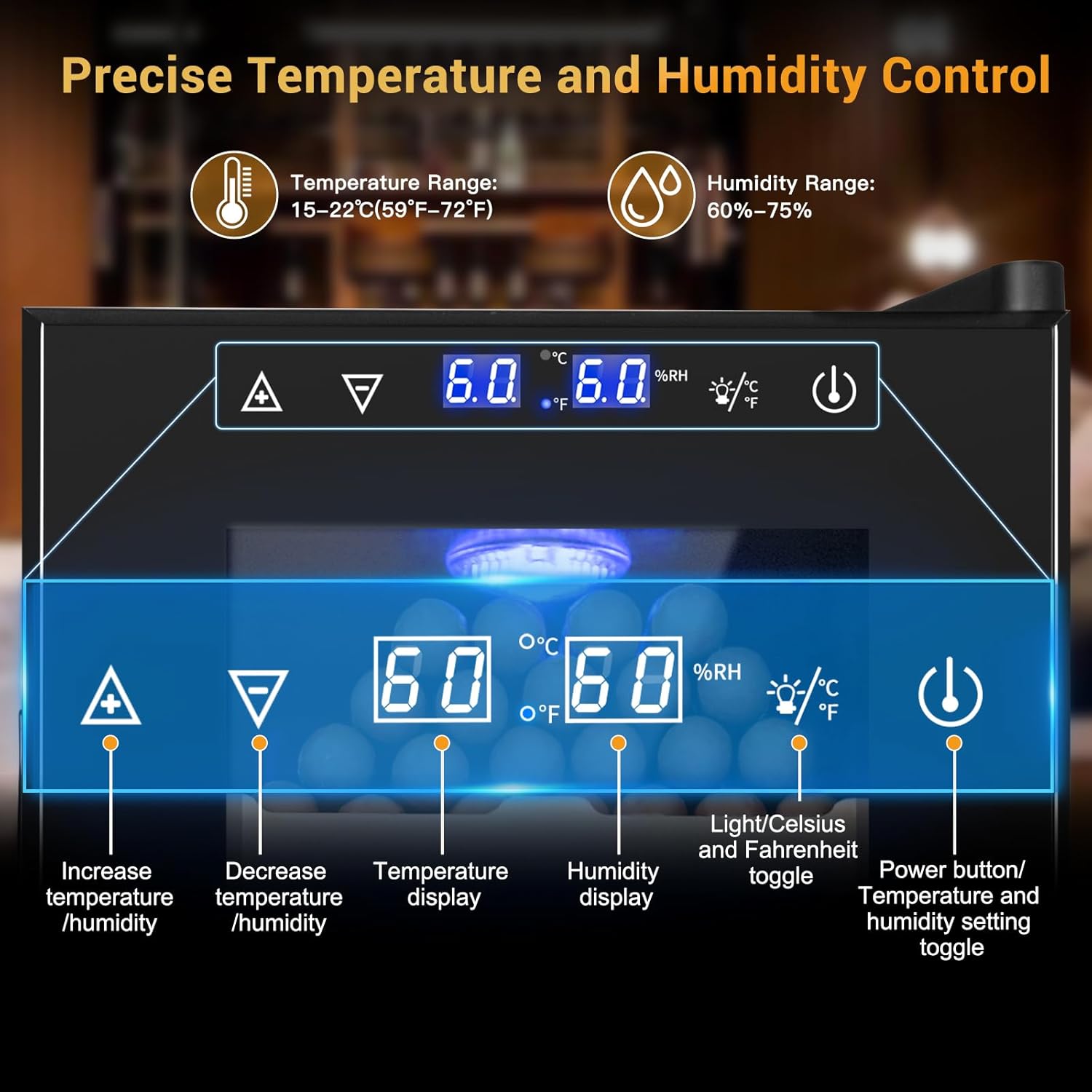 - Precision at Your Fingertips: Take charge with touch-controlled temperature and humidity settings, maintaining interior climates between 15-22°C (59-72°F) and humidity levels ranging from 60% to 75%, ensuring your cigars age gracefully.