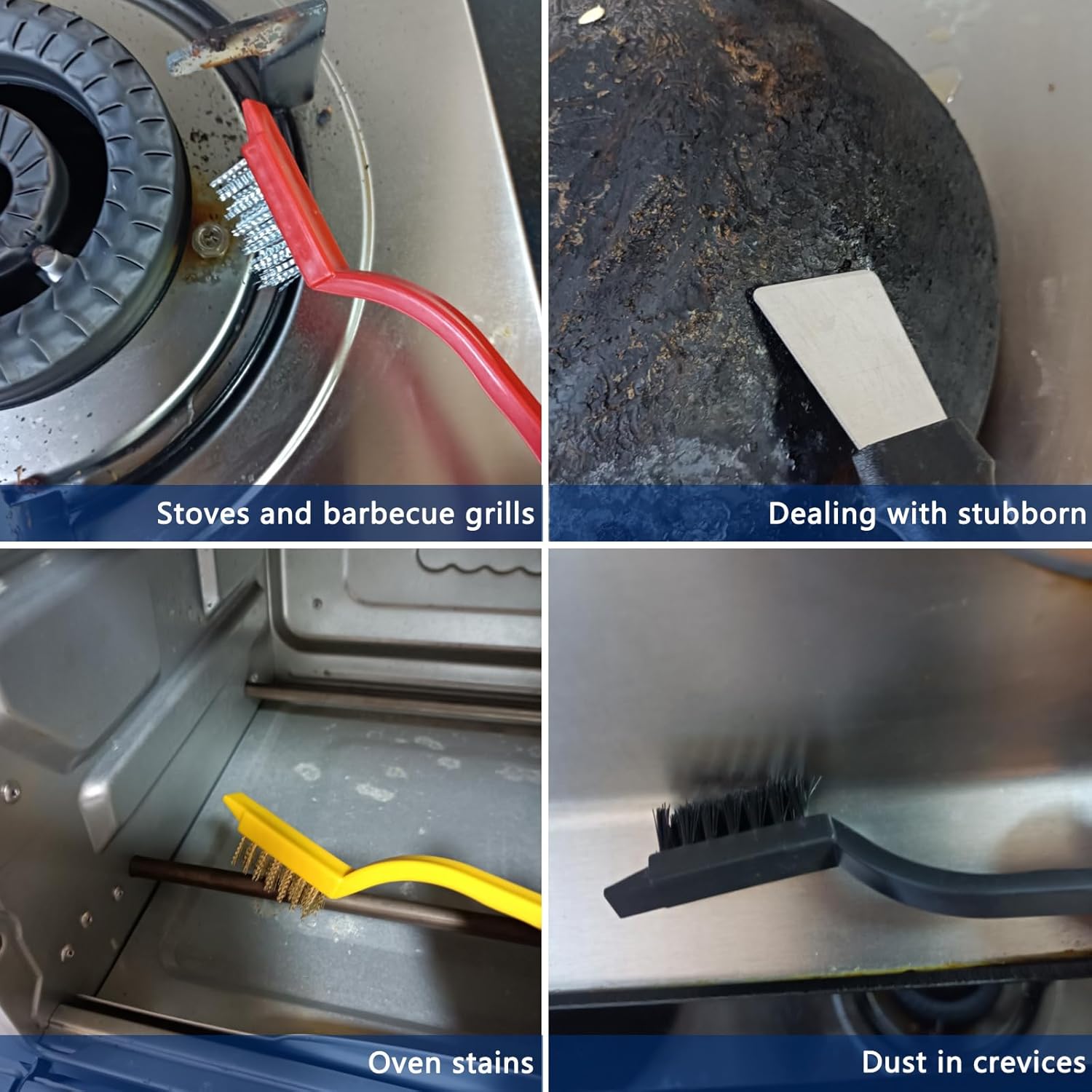 - Multi functional design: One end of the handheld gap cleaning brush is designed to remove loose dirt, and the other end is equipped with a scraper to solve stubborn dirt. The 2-in-1 function door and window cleaning brush can be folded and stored. One end is used for cleaning gaps, and the other end is used for collecting dust. The long handled white brush has a 90 ° angle and small bristles, making it easy to reach narrow spaces and effectively helping you clean areas that are difficult to clean or stubborn stains. Three small wire brushes, with bristles made of brass, stainless steel, and nylon, used for cleaning to varying degrees; Scraper can handle various stubborn dirt