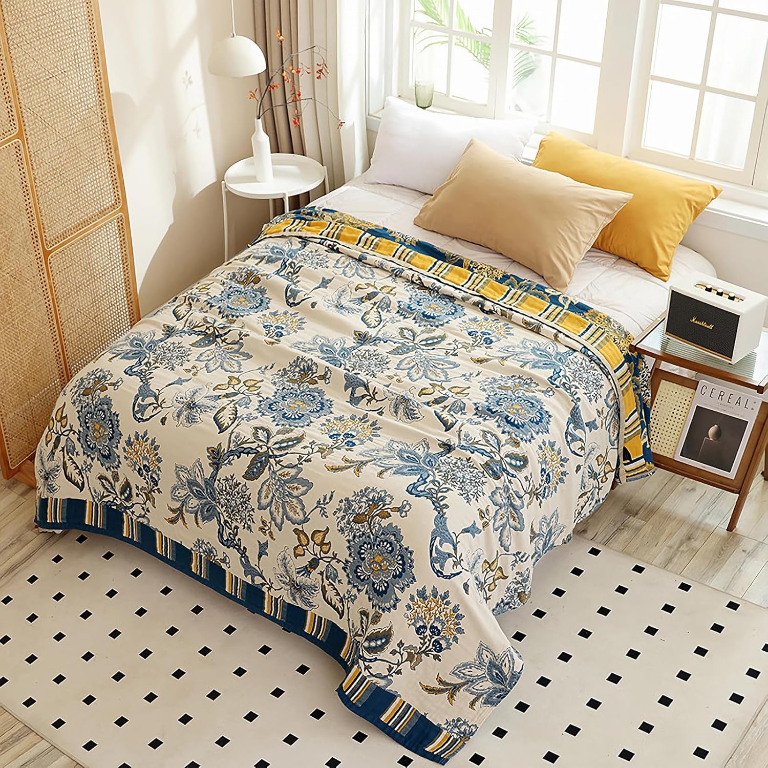 Snycler Boho Throw Blanket for Bed - 100% Cotton Ultra Soft Rustic Quilt - White Blue Floral Printed Farmhouse Decor Bed Blankets, 60"×80" All Season Rustic Throw for Sofa Couch Chair