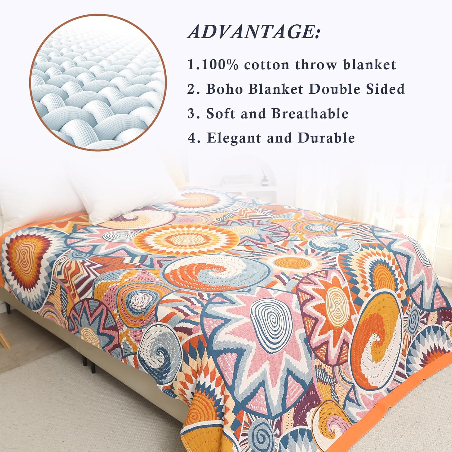Snycler Boho Throw Blanket for Bed - 100% Cotton Ultra Soft Rustic Quilt Fall Blanket - Orange Floral Printed Farmhouse Decor Bed Blankets, 60"×80" All Season Rustic Throw for Sofa Couch Chair