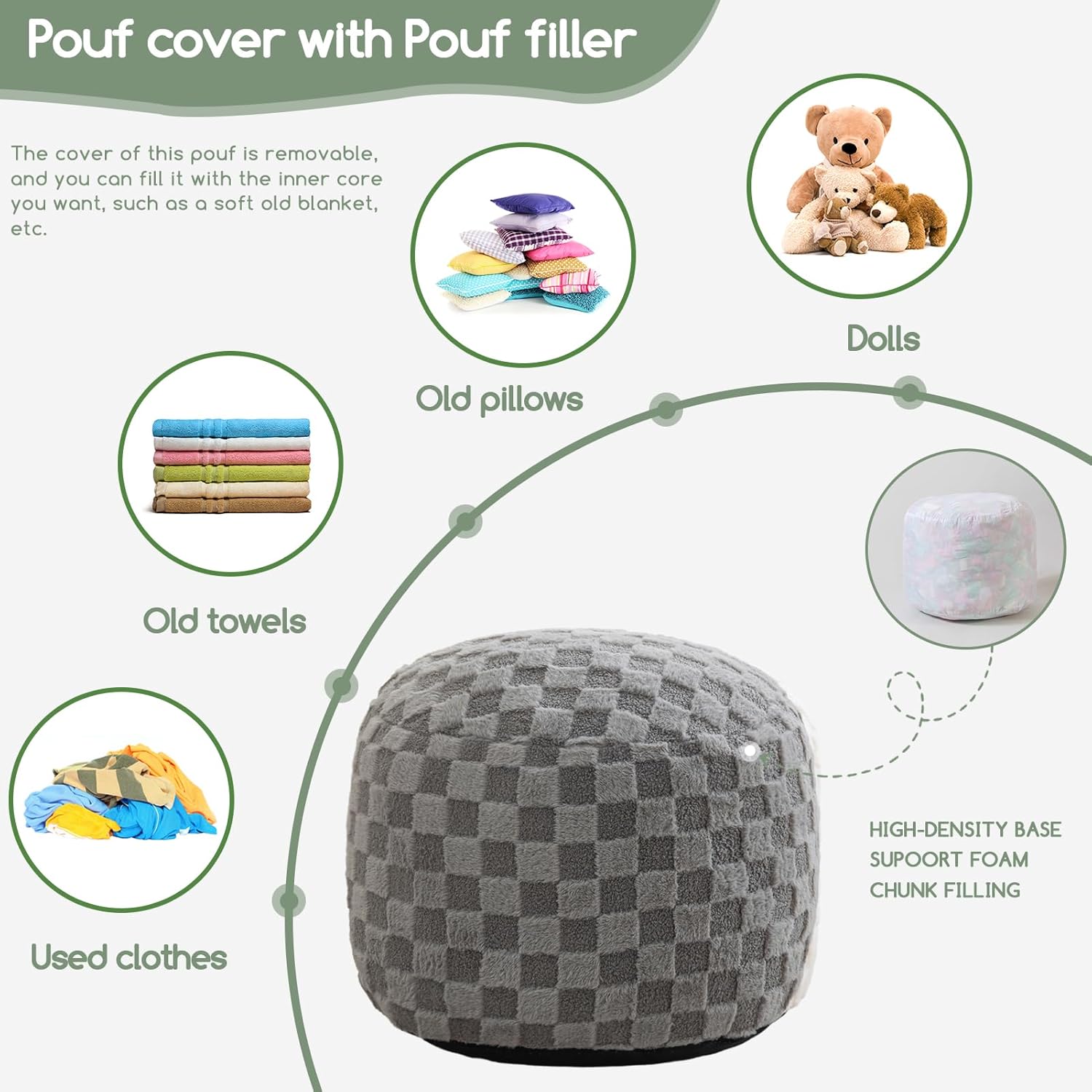 - For convenience and ease of use, this pouf ottoman comes pre-filled with memory foam chunk pouf filler, which can be easily inserted through the large round opening on the bottom with double zippers