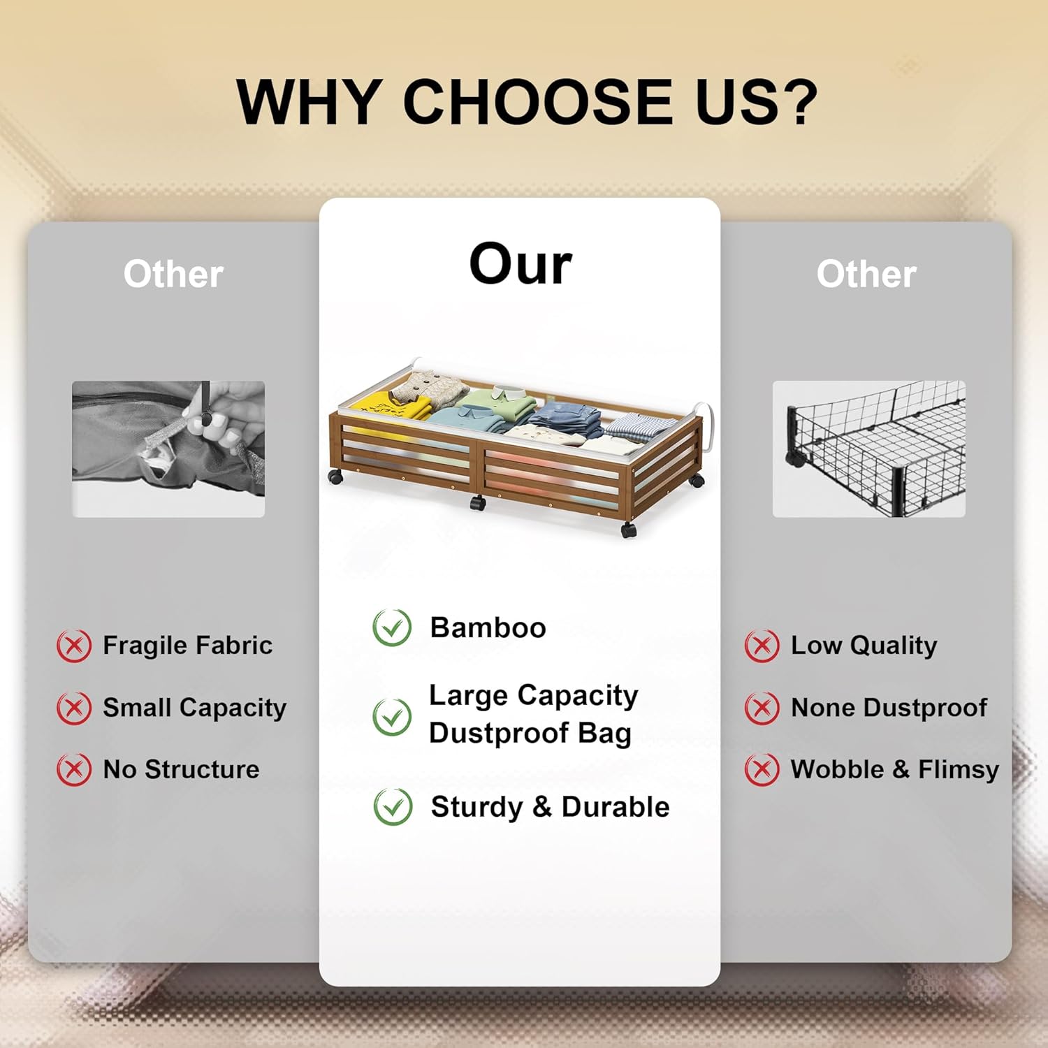 - ✅【Sturdy Under Bed Storage】:Our underbed storage units are built to last with high-quality 100% Real Bamboo,Beautiful appearance compared,oasting 4 rotating wheels with capacity of 120lbs, 48L large capacity dustproof cover bags hile the load-bearing capacity and durability are dramatically increased ,It's a versatile storage solution that can be customized based on your needs.