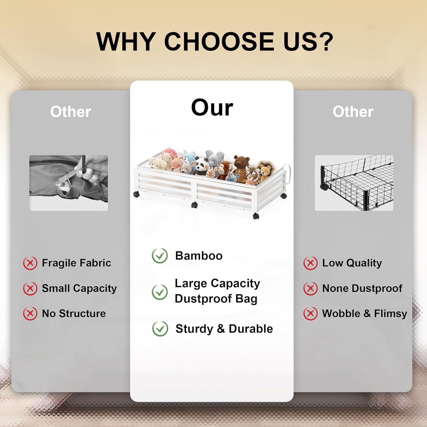 - ✅【Sturdy Under Bed Storage】:Our underbed storage units are built to last with high-quality 100% Real Bamboo,Beautiful appearance compared,oasting 4 rotating wheels with capacity of 120lbs, 48L large capacity dustproof cover bags hile the load-bearing capacity and durability are dramatically increased ,It's a versatile storage solution that can be customized based on your needs.
