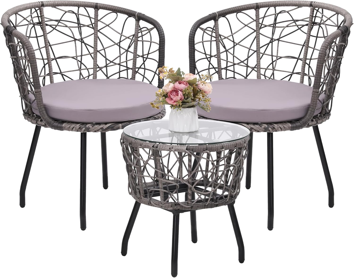 Kromax 3 Piece Bistro Set, Modern Outdoor Wicker Patio Furniture with Tempered Glass Table Top and 2 Chairs, Washable Cushions, Grey Rattan and Grey Cushion