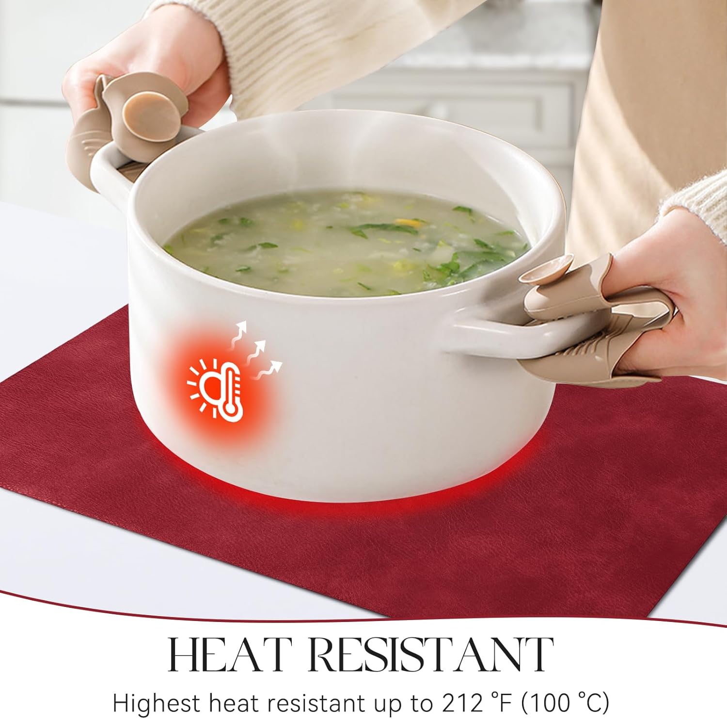 - PROTECT YOUR TABLE: Our placemats are 2mm thick and heat-resistant up to 212℉/100℃, which can protect your table from high temperatures and reduces noise from plates and flatware. It is an excellent choice to protect protect the surface of your dining table from hot dishes and liquid spills.