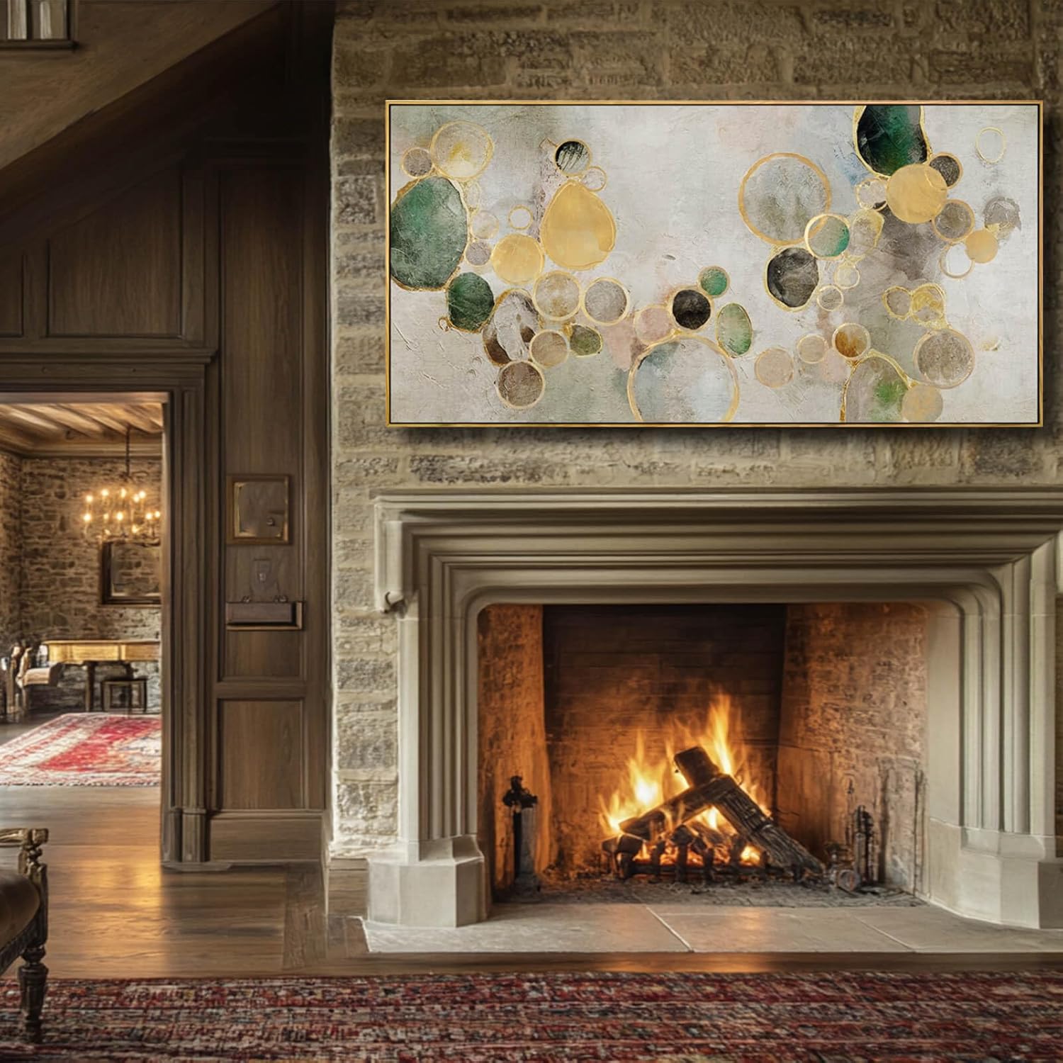 Abstract Canvas Wall Art Gold Circle Painting Green Artwork Framed Wall Prints 29"x 58" Office Wall Decor Colorful Pictures for Living Room Bedroom