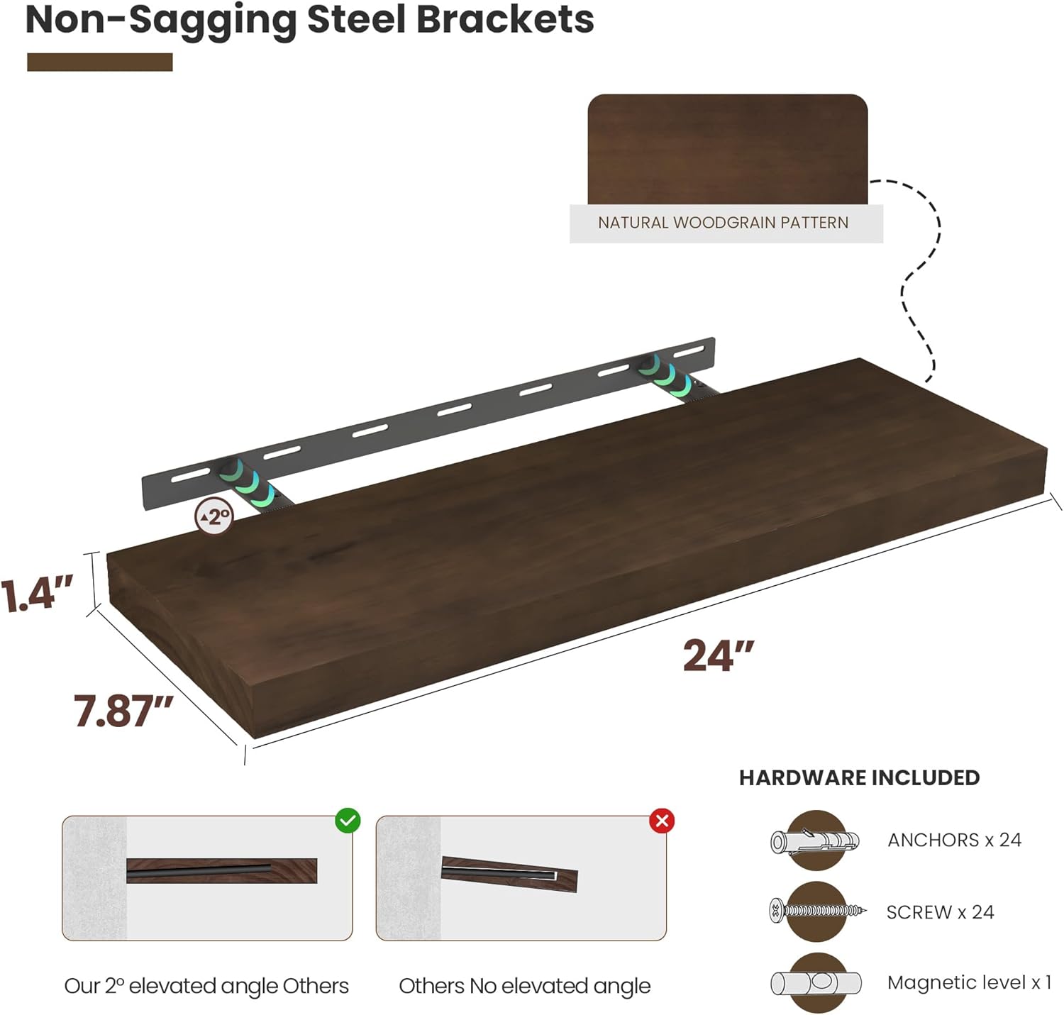 - Premium Wooden Floating Shelves -Unlike others, they are beautifully-finished, fantastic-smelling solid pine,and they are handcrafted out of finest solid pine wood measuring 24" x 8" x 1.38",revealing its own character of knots and natural wood grain, making each ledge a little different but equally stunning.