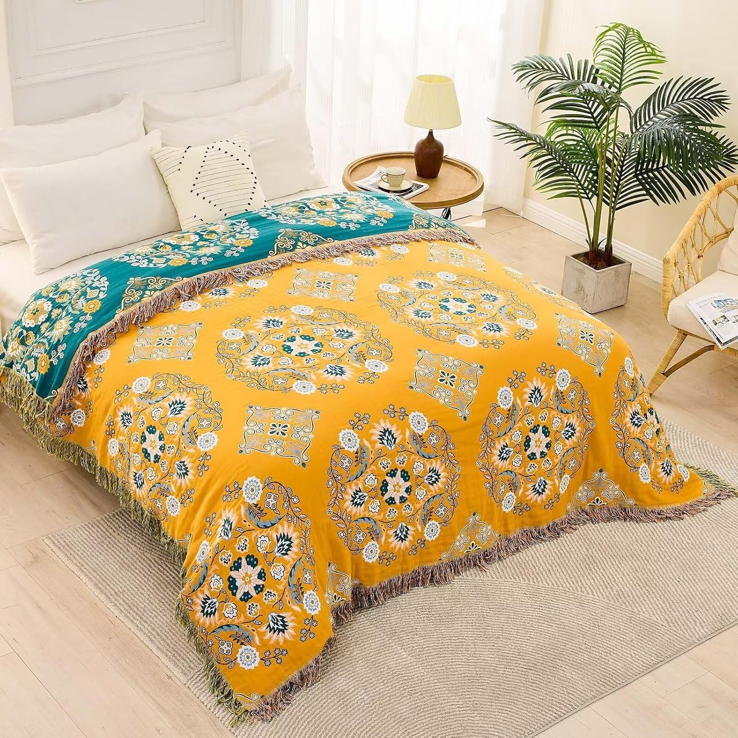 Boho Throw Blanket, 100% Cotton Ultra Soft Luxury Throw Rustic Quilt, Floral Printed Farmhouse Decor Bed Summer Blankets, All Season Rustic Reversible Bohemian Throw for Bed (90"x98" Yellow