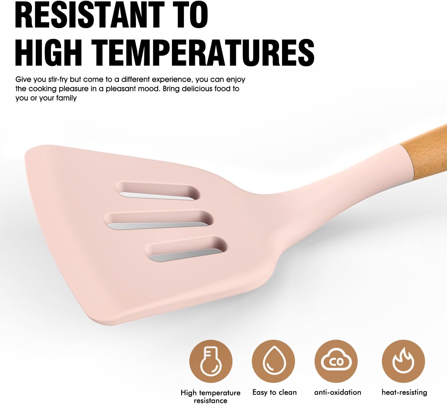 - NON-DEFORMABLE, EASY TO CLEAN: We've designed these silicone kitchen utensils sets with stainless steel cores wrapped in silicone for shape retention and flexibility. No warping or cracking, no hassle. The silicone utensils for coking one- piece construction ensures no pesky gaps where food can hide, making cleaning a breeze. Due to the unique nature of wooden handles, we recommend handwashing
