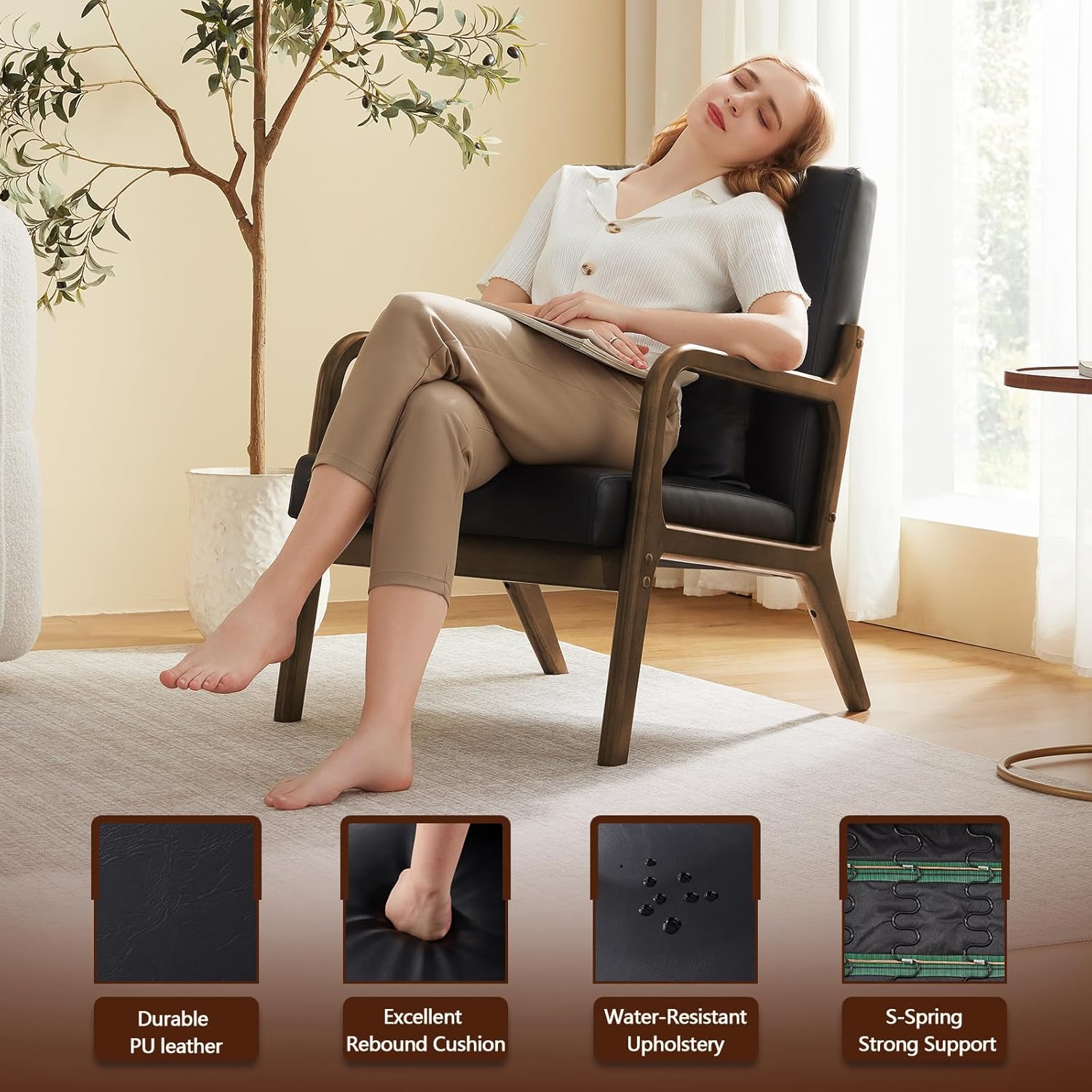 Accent Chair Mid Century Modern Armchair with Lumbar Support Pillow Wood Legs PU Leather Upholstered Lounge Chairs Comfy High Back Cushion for Living Room Bedroom
