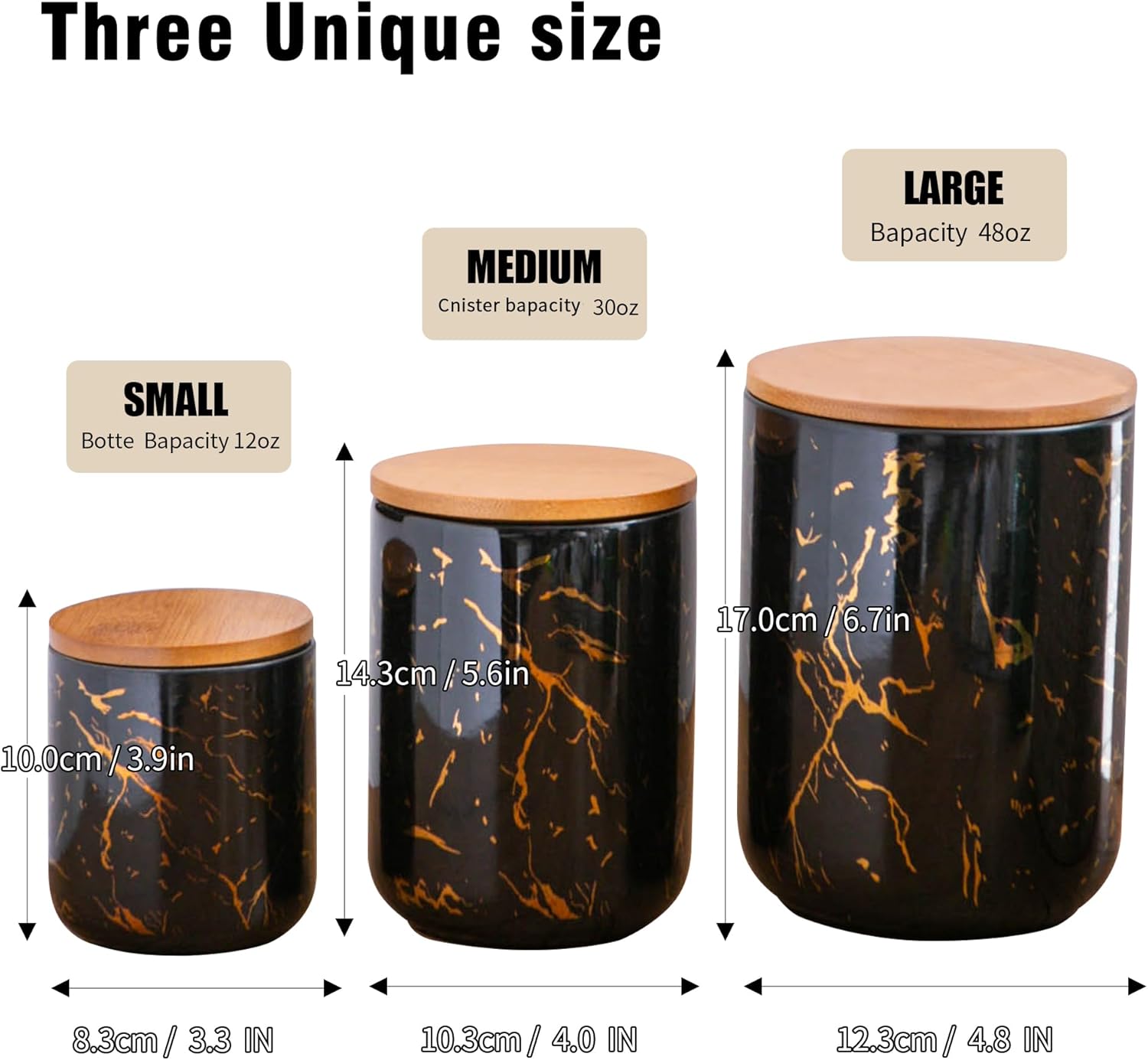 - Multi-Size Kitchen Storage Canisters: This set of ceramic canisters comes in three different sizes: Large (6.7x4.8x4.8 inches) is ideal for coffee beans, long pasta, and oats; Medium (5.6x4.0x4.0 inches) suits tea leaves, sugar, and flour; Small (3.9x3.3x3.3 inches) is perfect for spices, nuts, and dried fruits. Each size helps keep your pantry organized and ingredients fresh.