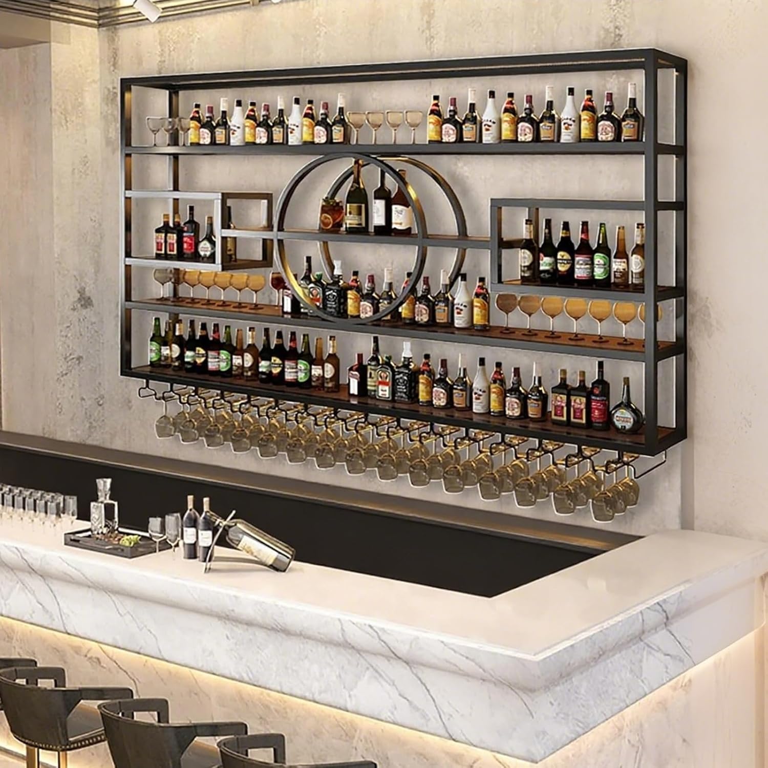 - γLarge Storage SpaceγThe wall-mounted wine rack can be used as a bar decoration or a large wine storage cabinet. This height can store most wines or spirits when we sit at a small bar to relax all day or have a party. The wine glass rack is sturdy enough to hold more wine glasses. The wine rack doubles as a large storage rack, making the space look neat and organized