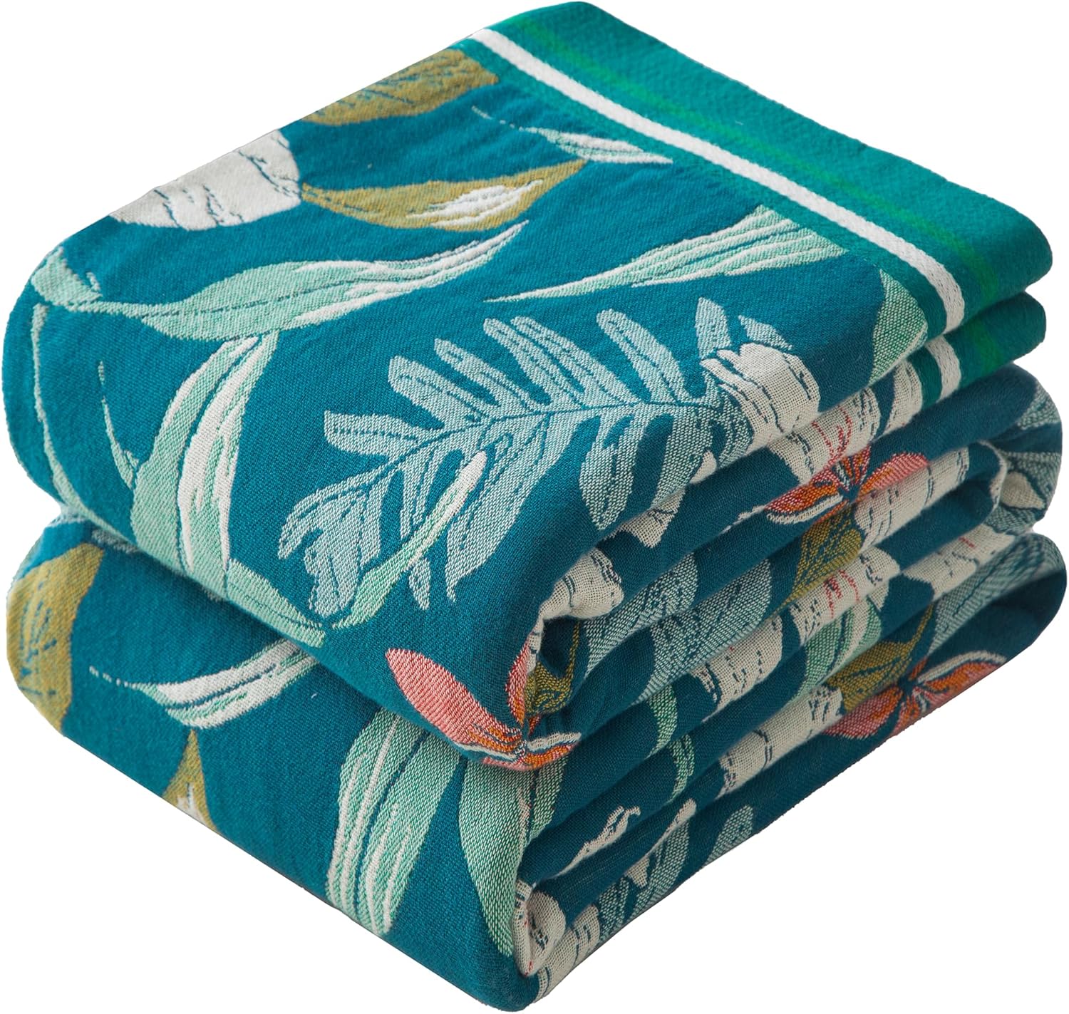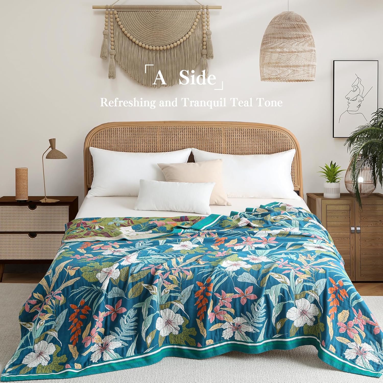 Boho Throw Blanket Full Size, Extra Large Soft Cozy Cotton Muslin Quilt Blanket for Bed Decor, Floral Patterned Couch Sofa Chair Cover, Vintage Farmhouse Cottage Woven Blanket, Teal&Green