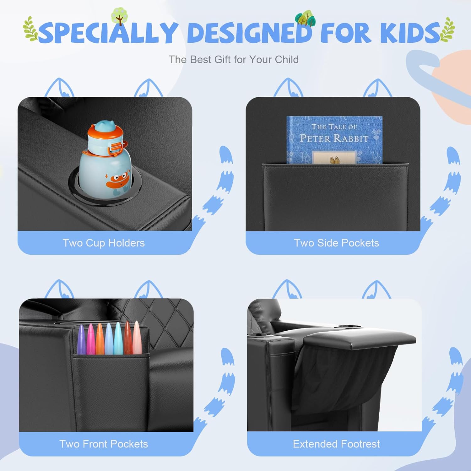 Kids Recliner Chair, Leather Push Back Kids Reclining Chair with Cup Holders & Side Pockets, Safety Adjustable Footrest Toddler Recliner for Age 3+, Kid Recliners for Girls Boys, Black