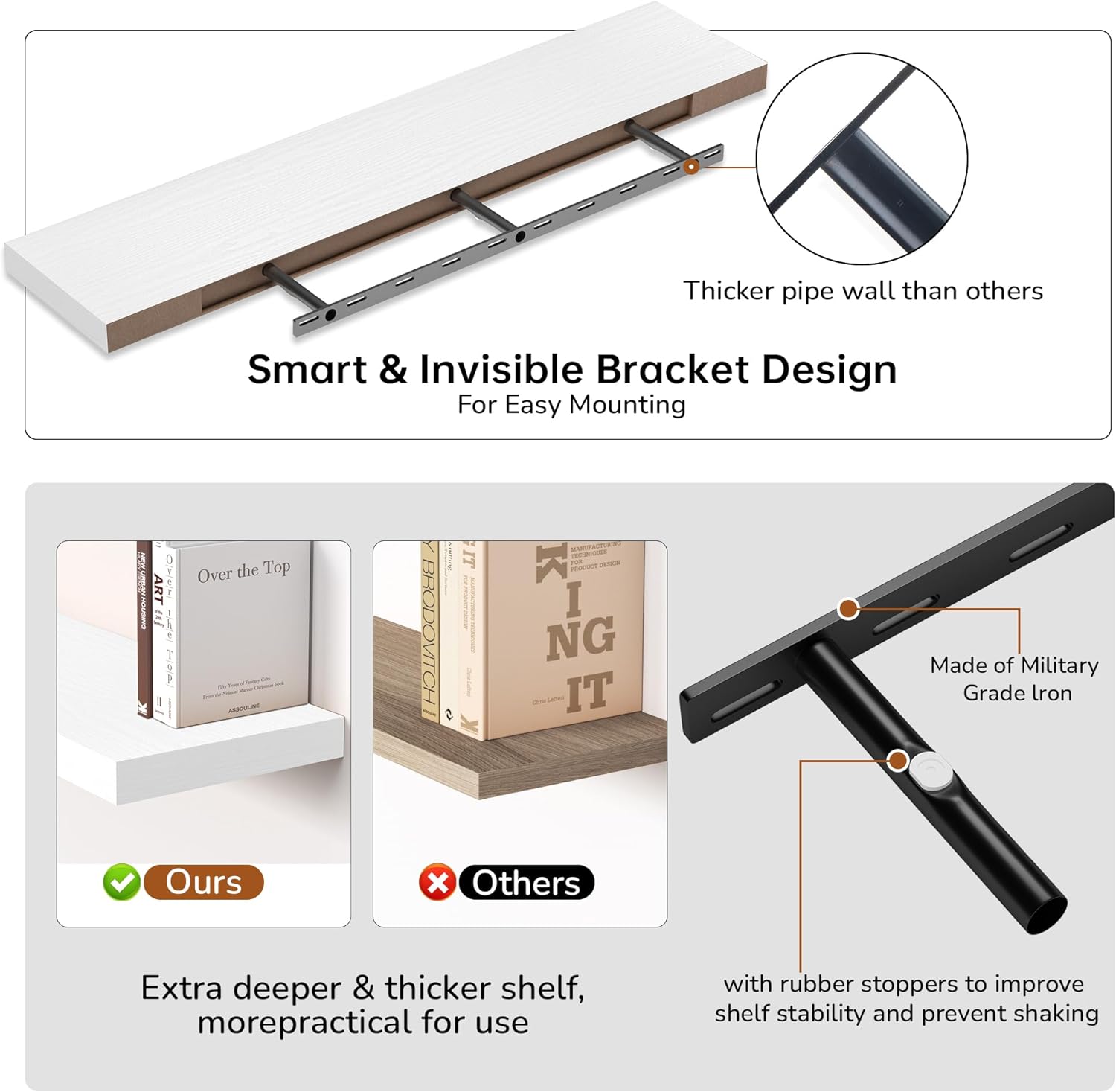 - Extra Deeper & Thicker - Each board measures 48"W x 8"D x 1.8"H. Extra deeper and thicker design in order to bring maximizes storage space and weight capacity, even hold up to 75 lb each. This floating shelf taking up zero square feet, reduces clutter and highlights décor in compact spaces.