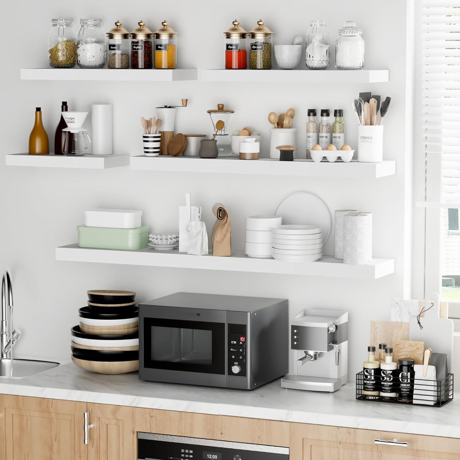 - Versatile & Multi-Scene Functionality: Our floating shelves are available in a variety of sizes and thicknesses, allowing you to choose the perfect fit for your space. Use them in the bathroom to store beauty products, hair care items. In the bedroom, they can hold books, cosmetics, and personal items. In the kitchen, they’re perfect for spices, jars, or small utensils. Or display photo frames, trophies, or collections in the living room. These shelves efficiently use wall space to create a tidier, more spacious feel in any room.