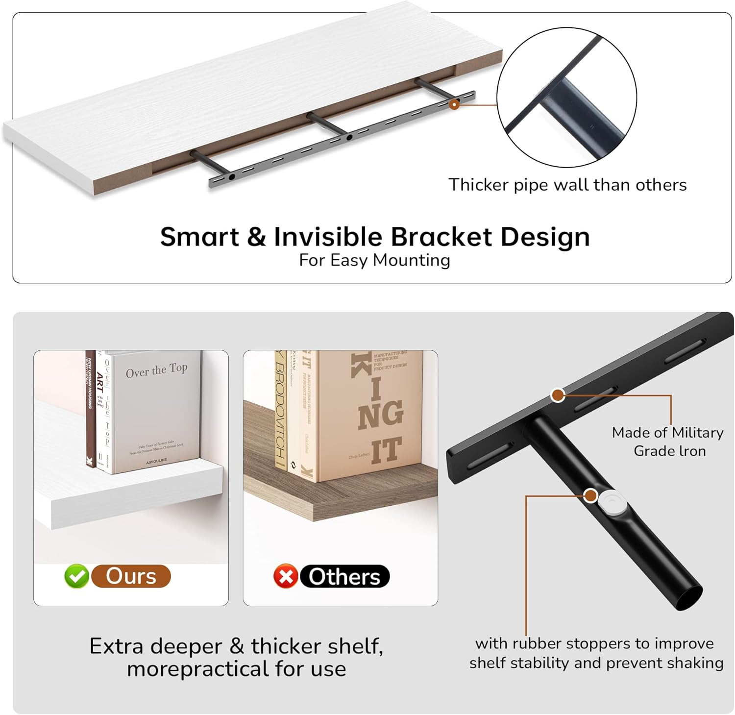 - Extra Deeper & Thicker - Each board measures 55"W x 12"D x 1.8"H. Extra deeper and thicker design in order to bring maximizes storage space and weight capacity, even hold up to 80 lb each. This floating shelf taking up zero square feet, reduces clutter and highlights décor in compact spaces.