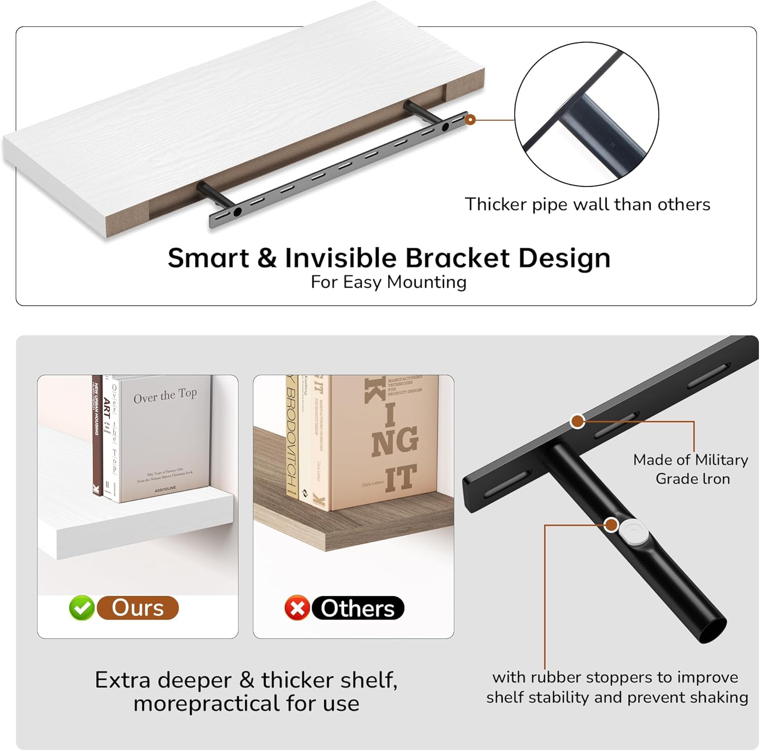 - Extra Deeper & Thicker - Each board measures 36"W x 12"D x 1.8"H. Extra deeper and thicker design in order to bring maximizes storage space and weight capacity, even hold up to 70 lb each. This floating shelf taking up zero square feet, reduces clutter and highlights décor in compact spaces.