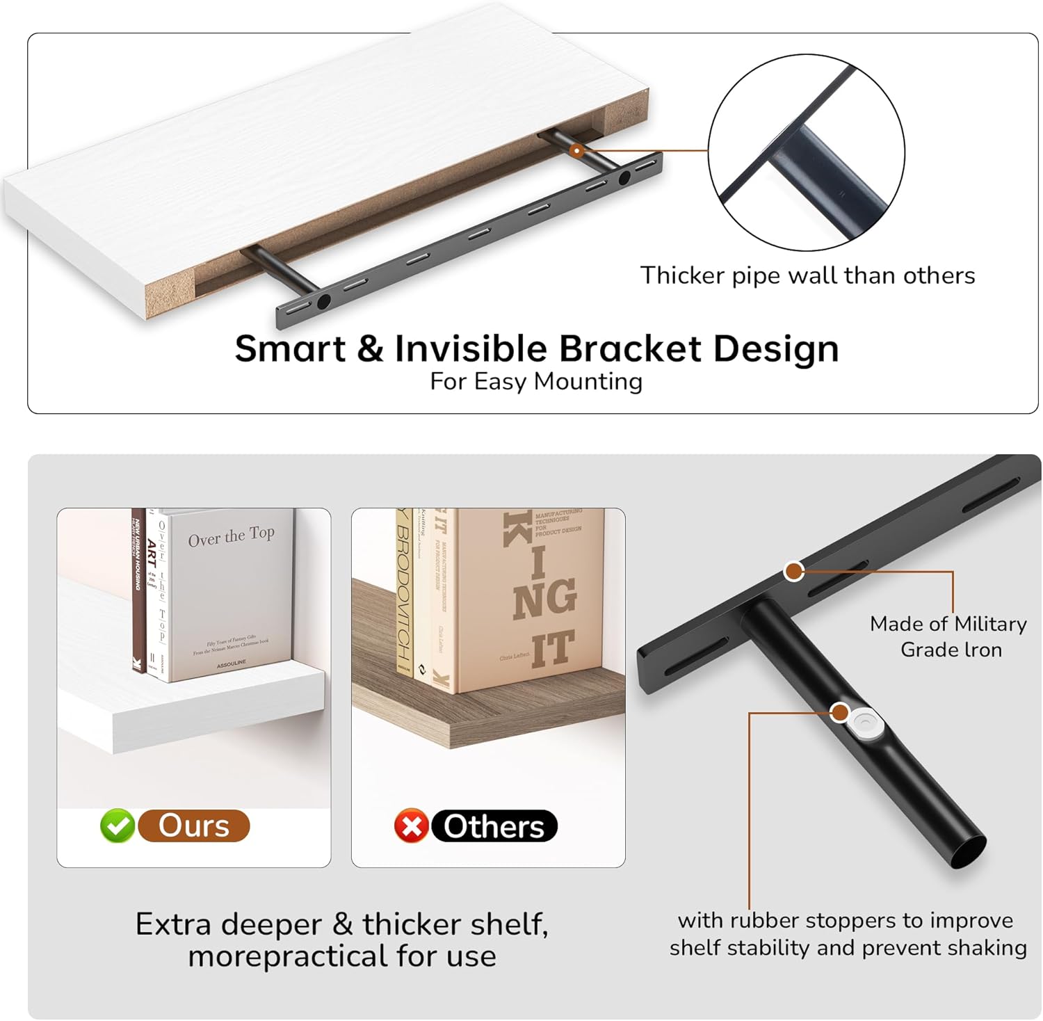 - Extra Deeper & Thicker - Each board measures 24"W x 8"D x 1.5"H. Extra deeper and thicker design in order to bring maximizes storage space and weight capacity, even hold up to 50 lb each. This floating shelf taking up zero square feet, reduces clutter and highlights décor in compact spaces.