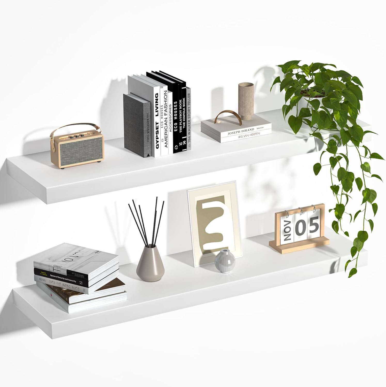 - Extra Deeper & Thicker for Storage - Each board measures 30"W x 8"D x 1.4"H. Extra deeper and thicker design in order to bring maximizes storage space and weight capacity, even hold up to 70 lb. This floating shelf taking up zero square feet, reduces clutter and highlights décor in compact spaces. It can help make full use of the empty wall, making it much more space-saving and making your room look larger and tidier.