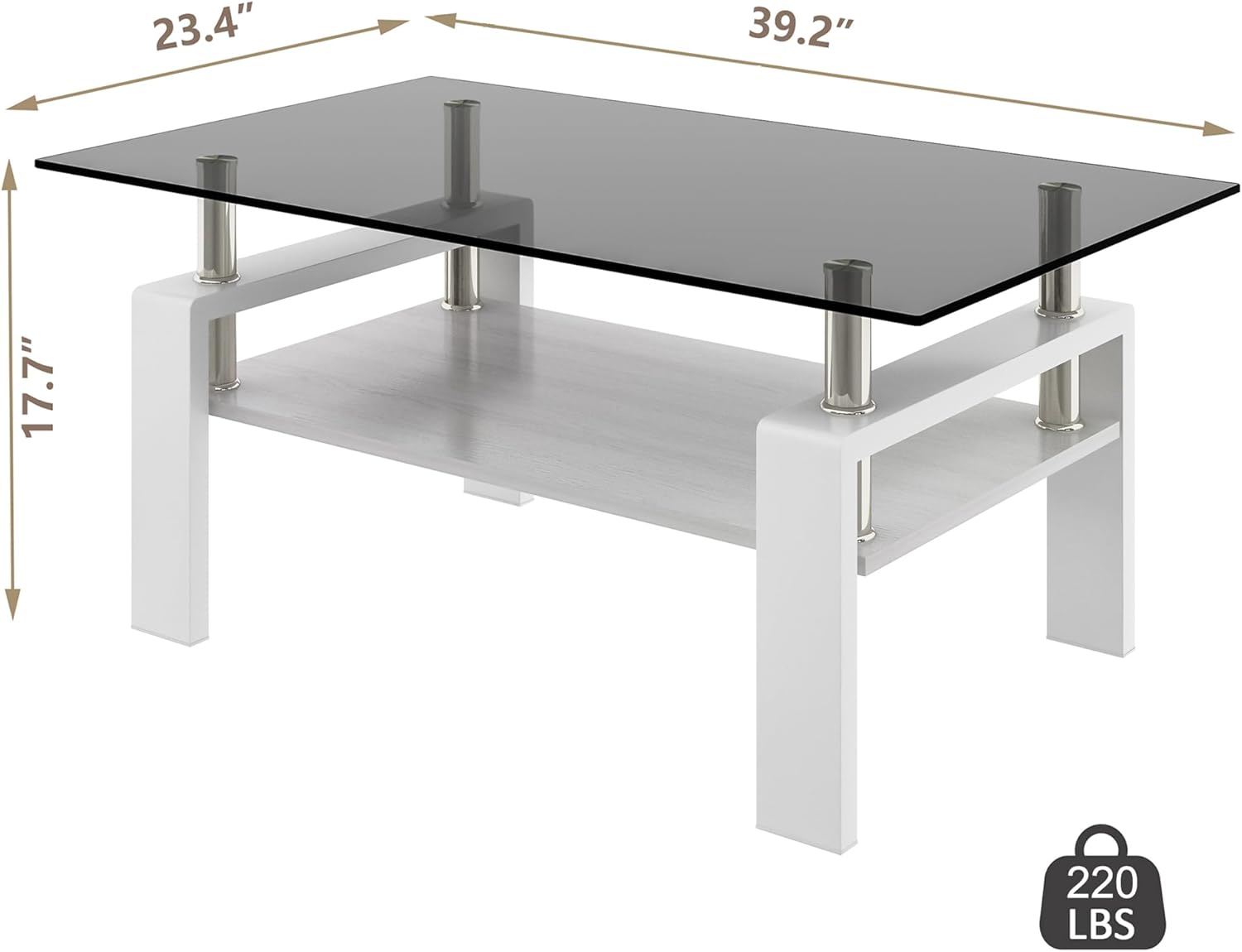 - Spacious and Sturdy Design: Measuring 39.2"L x 23.4"W x 17.7"H with a load-bearing capacity of 220 lbs, this glass coffee table offers ample space and reliable support, making it ideal for any living room or office setting.