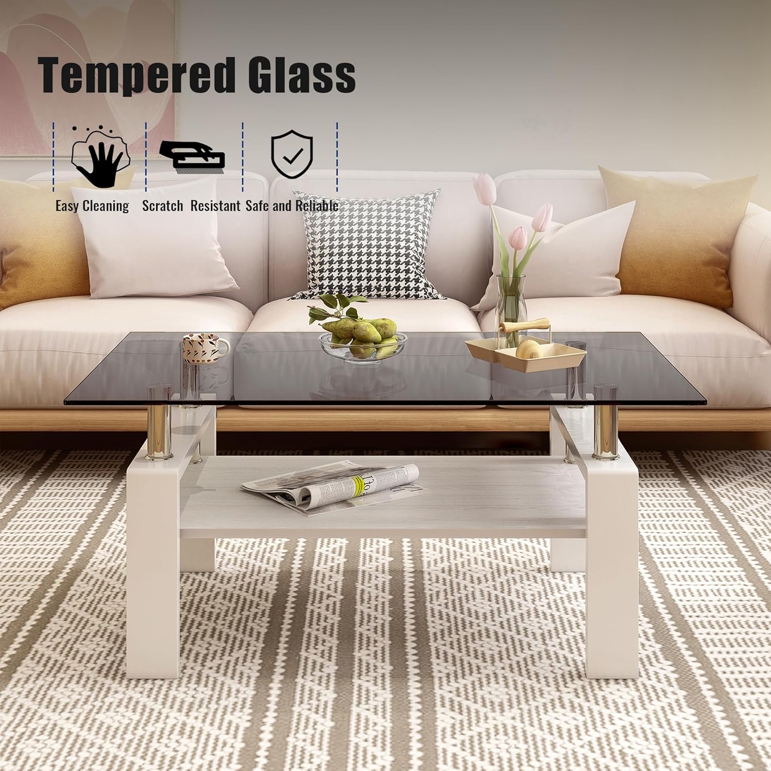 - Convenient Storage Space: The table is equipped with a sturdy white MDF layer underneath the glass top, offering additional storage space for organizing your living room essentials, books, or décor items.