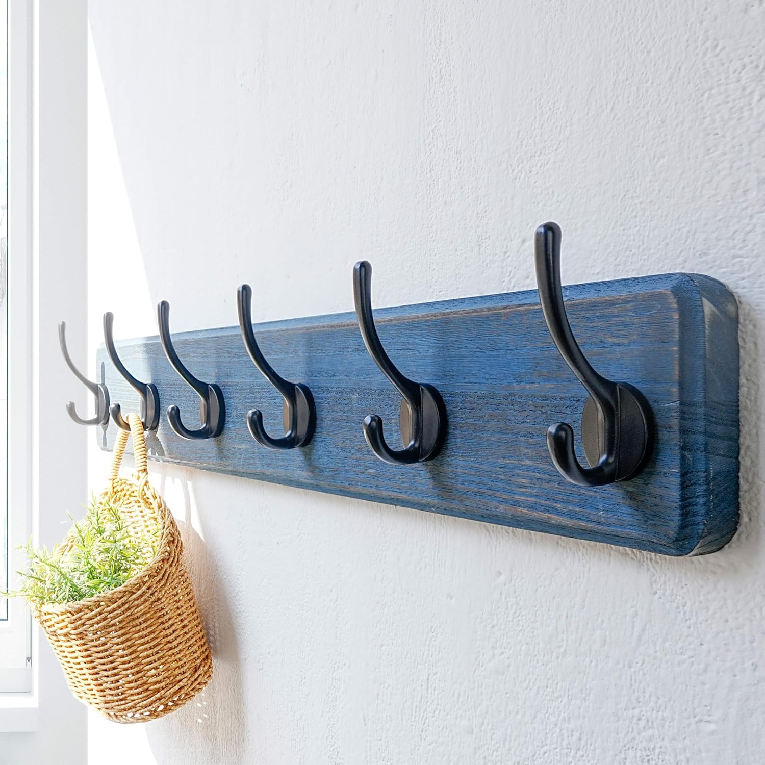 Dseap Coat Rack Wall: 24" Long, Patented, Heavy-Duty, 6-Double-Hooks Wooden Wall Mounted Coat Rack Coat Hanger Hook Rail for Winter Coats Hat Jacket Clothing, Weathered Blue