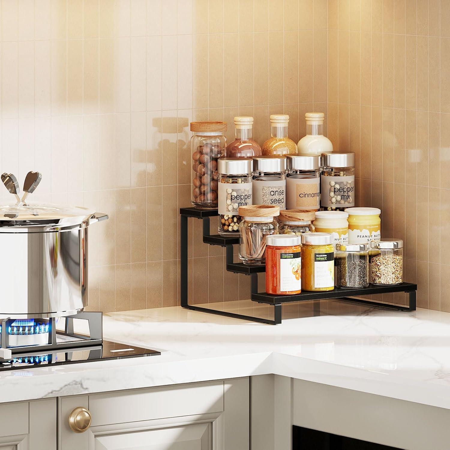 - Easy Access and Visibility: The tiered spice rack design allows for easy access and clear visibility of all your spices, so you can quickly find what you need while cooking. Say goodbye to rummaging through drawers and cupboards