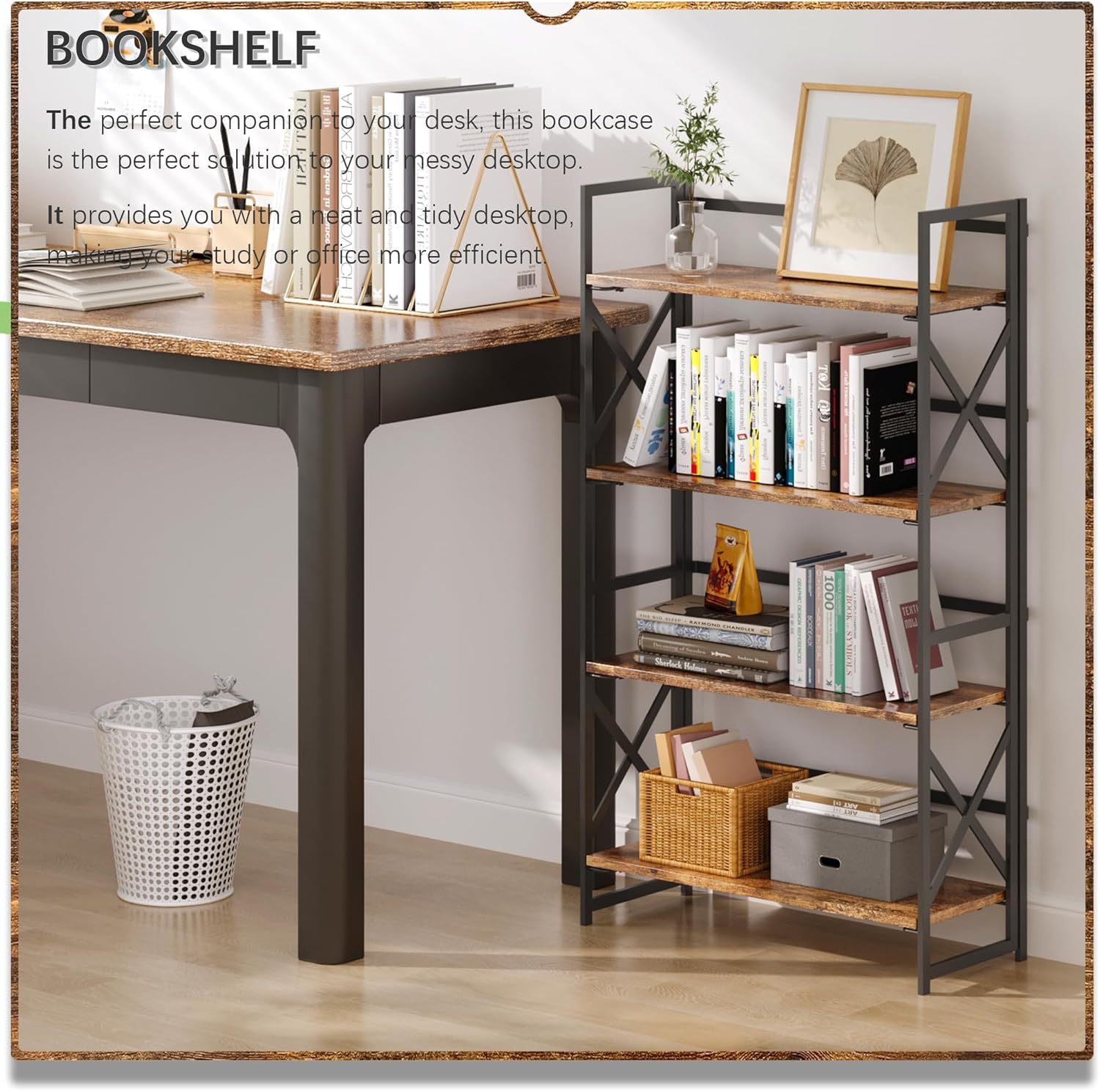 4NM 4 Tiers No Assembly Book Shelves, 41.3" H Folding Bookshelf Bookcase Open Industrial Foldable Shelves for Bedroom, Living Room, Home Office - Rustic Brown Black